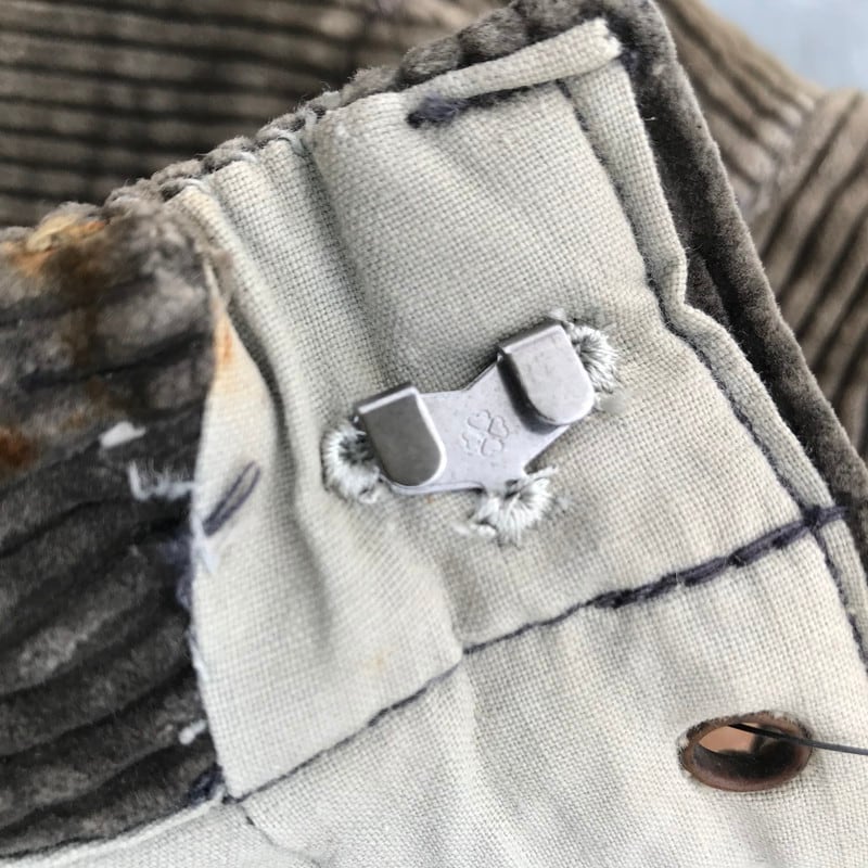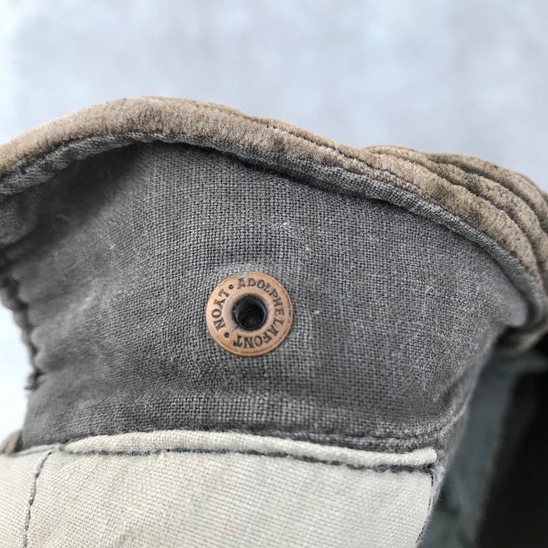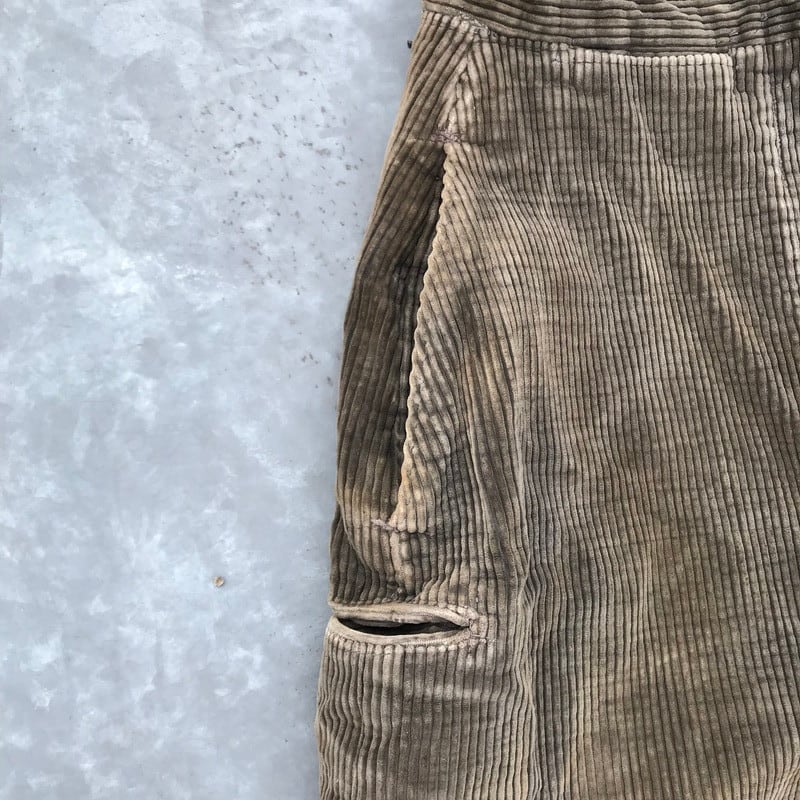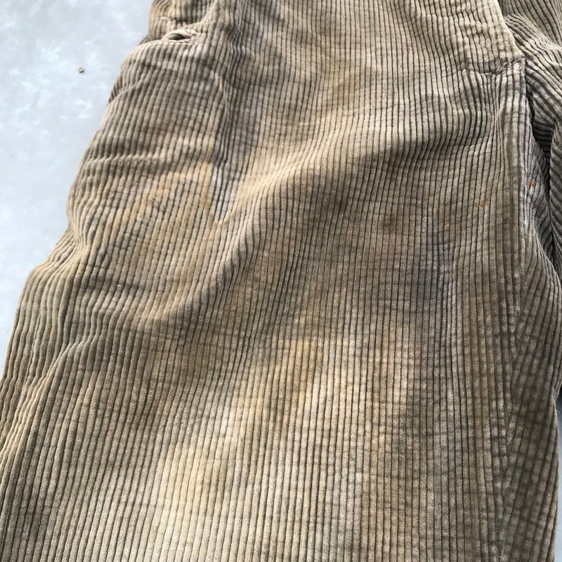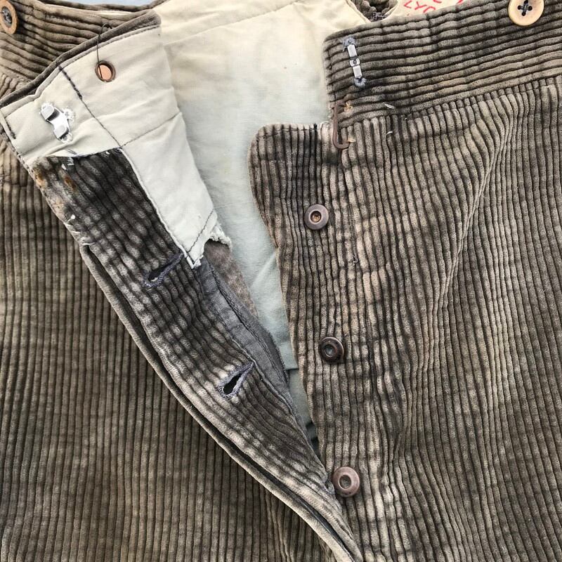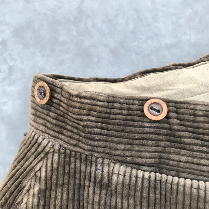 30年代から40年代頃のADOLPH LAFONTの太畝コーデュロイファーマーズパンツです。ダミアンコーデュロイとも呼ばれる厚手で非常にコシのある丈夫なでハンティングジャケットなどにも使用された生地で作られております。グレーとブラウンの【】中間のような色合いでフェード具合もすばらしい1本です。フロントのオリジナルフックは片方が壊れている為別のフックが取り付けられています。裾に向かってラウンドしている独特なシルエットとなります。ツイードジャケットに合わせてトラッドな着こなしにお勧めです。【ウエスト平置き】41cm