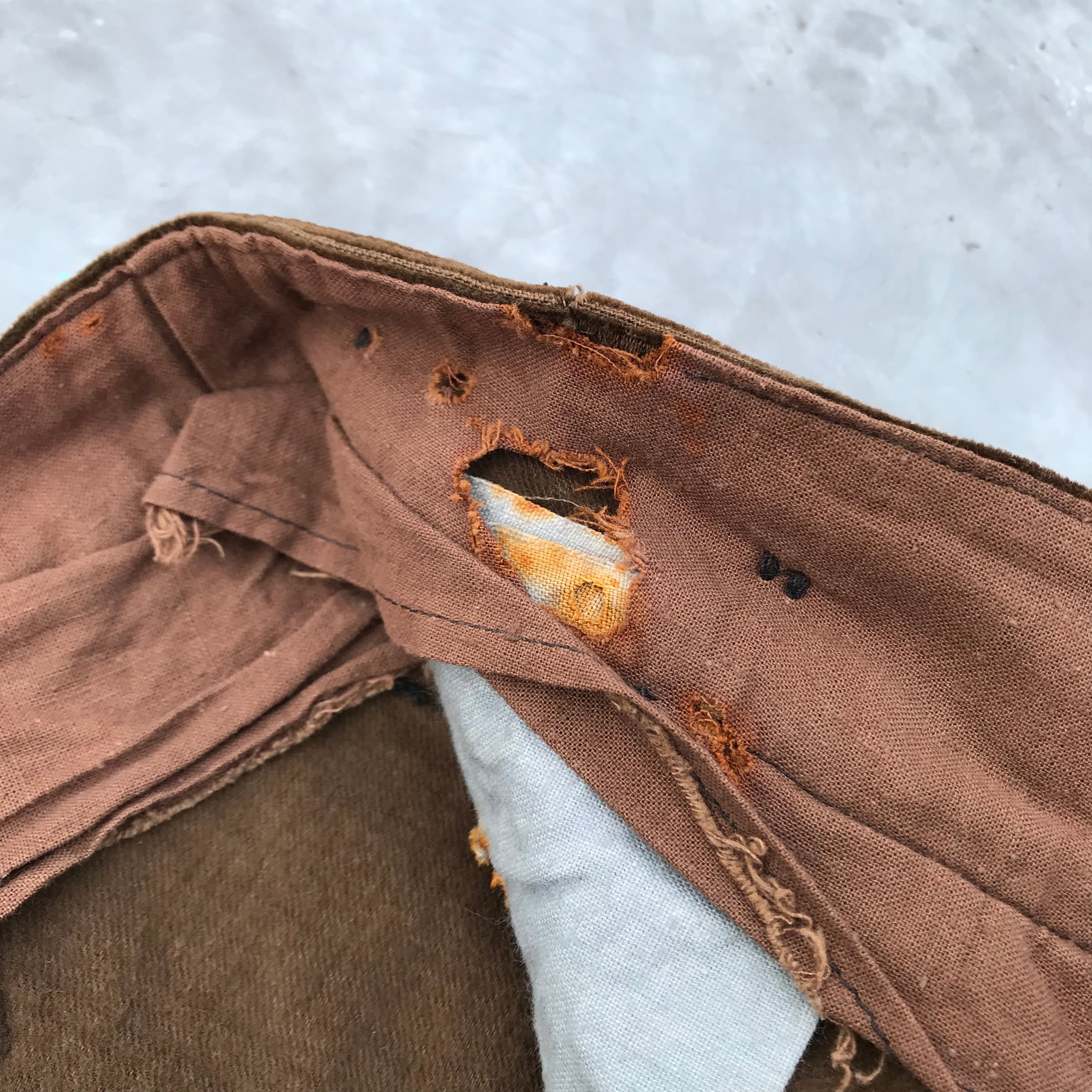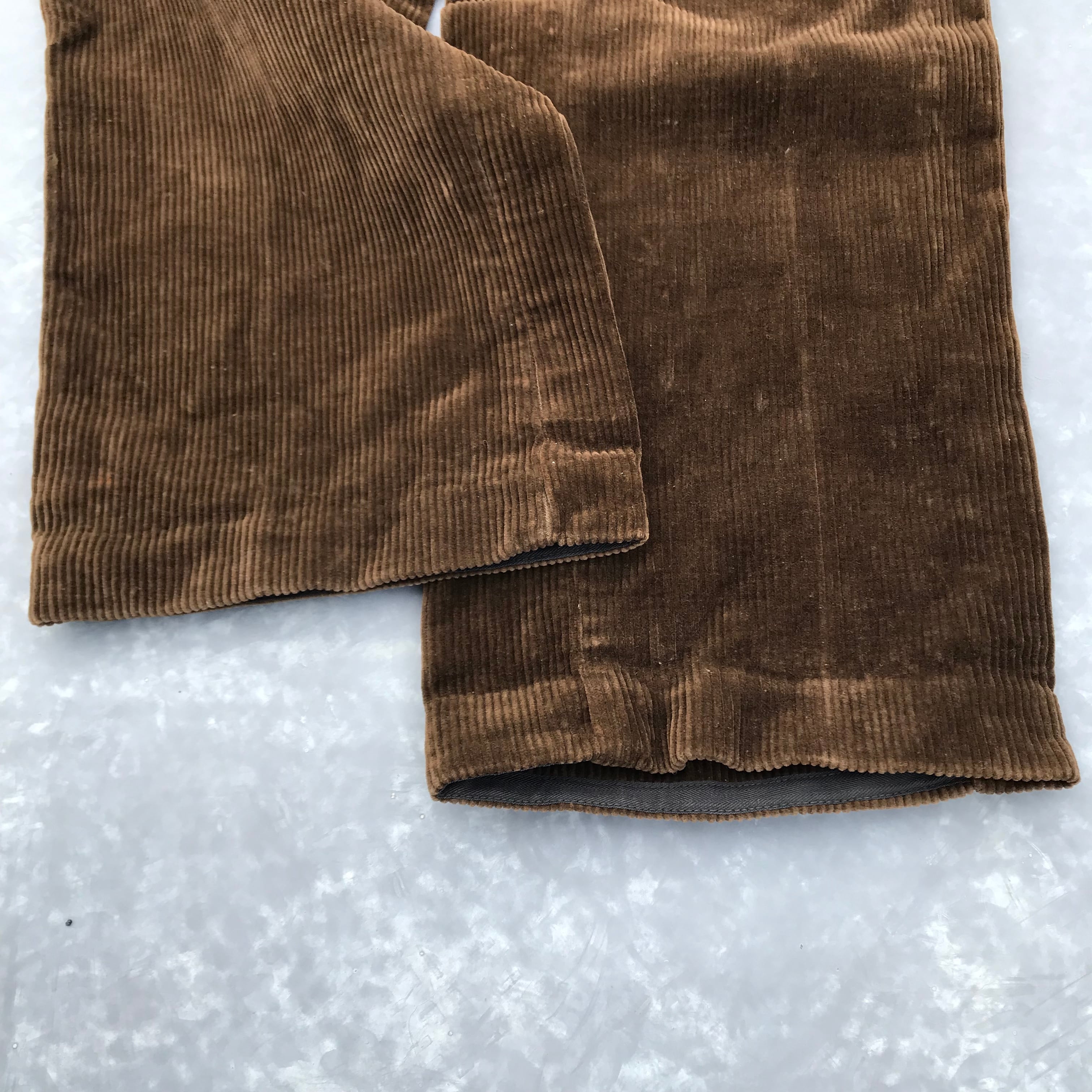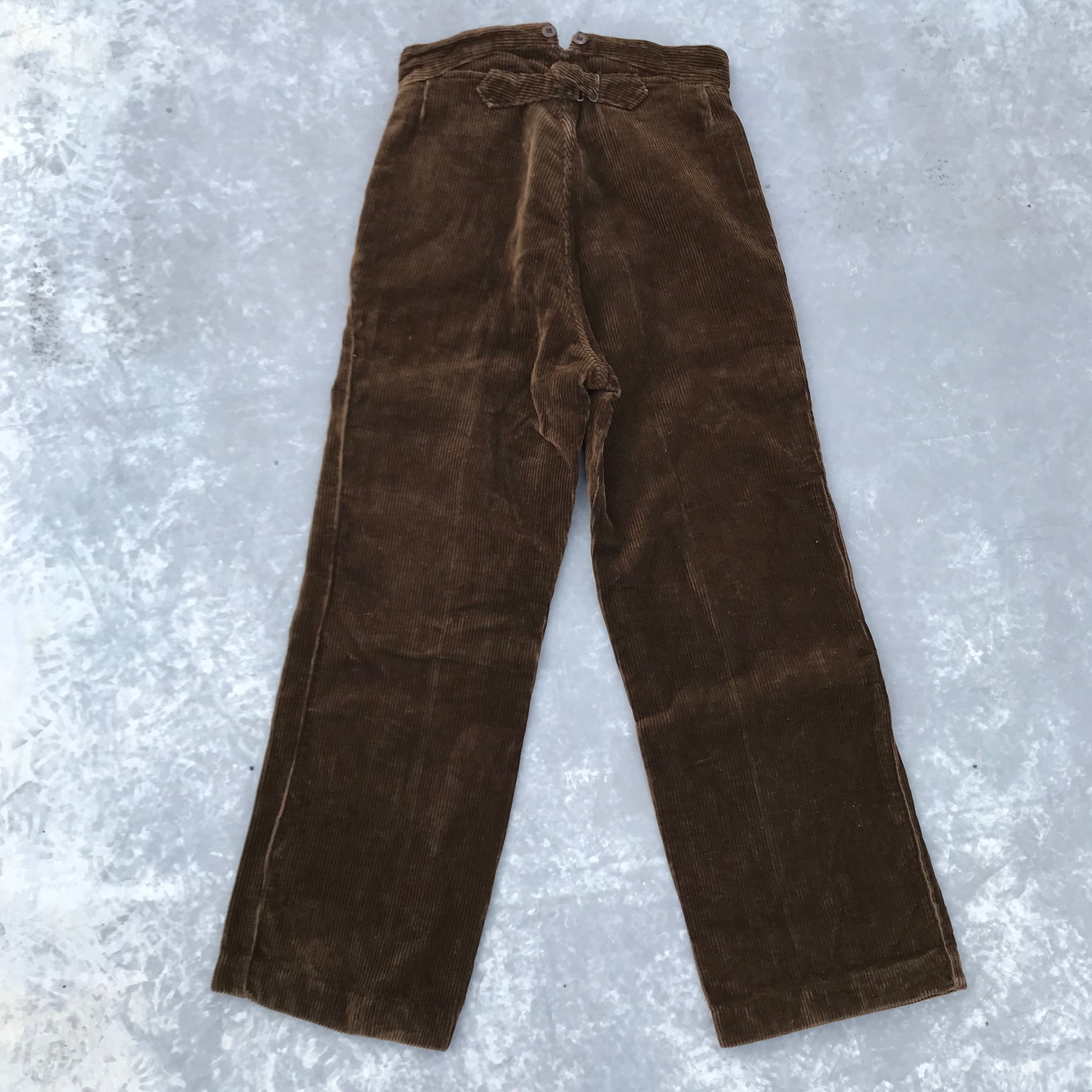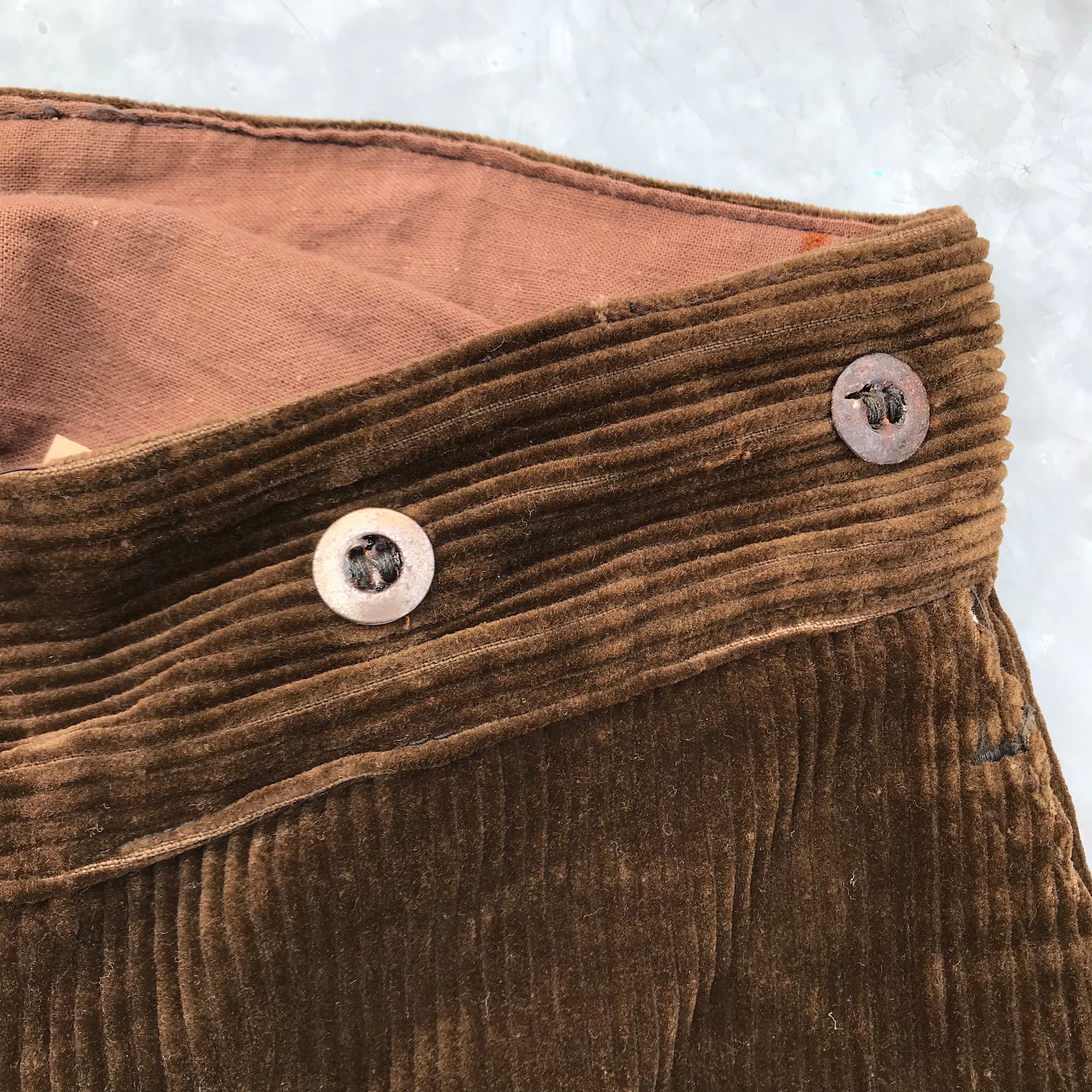 40年代から50年代頃のものと思われる太畝コーデュロイパンツです。濃いブラウンで腿辺りに生地が薄くなっている小さな箇所がございます。生地は厚手ですが柔らかめです。サスペンダーボタンがいくつか欠損しています。針刺しのシンチバックで古いディティールとなります。ウエスト内側にも錆びによる穴の開いた箇所がございますが年代を考慮しても比較的綺麗なアイテムといえそうです。W32ですので、はき易いサイズ感です。【ウエスト平置き】40cm【ヒップ平置き】52cm