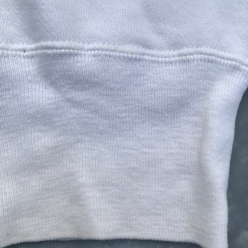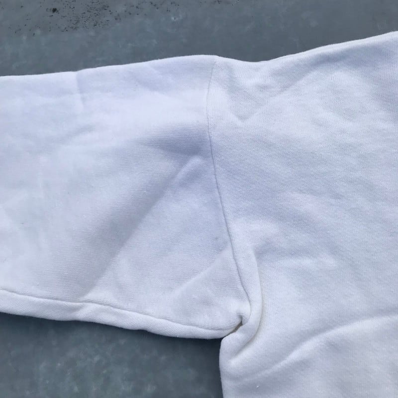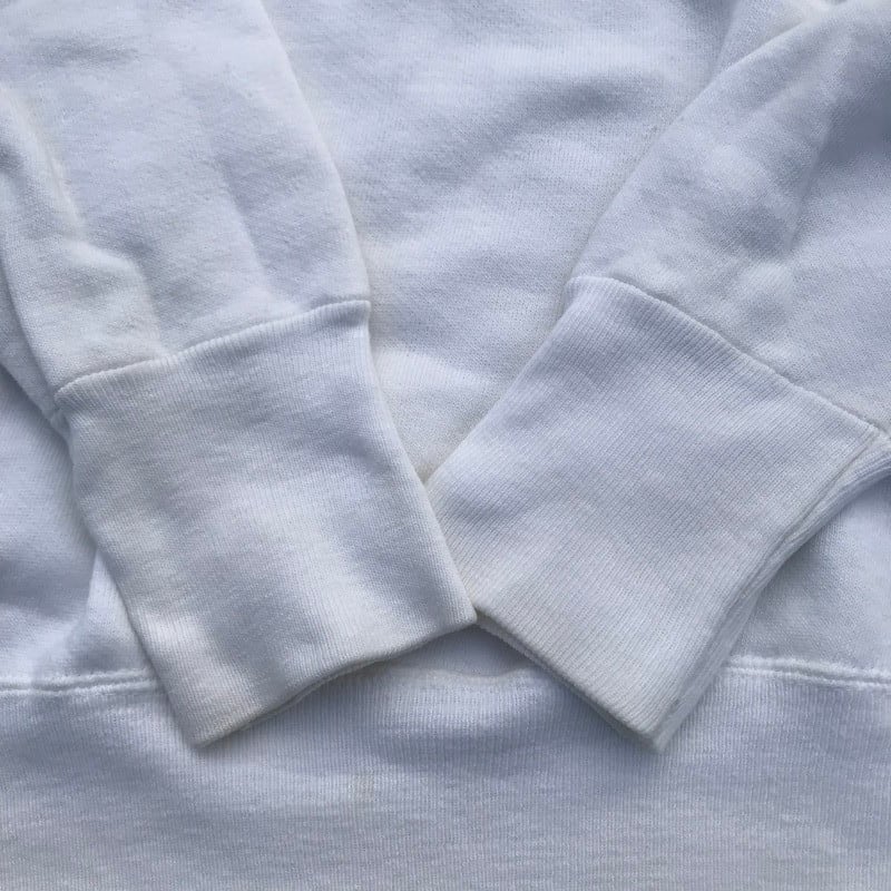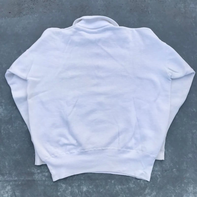 50年代から60年代頃のハーフジップスウェットシャツです。FALCON社のアルミピンロックジッパーを使用しています。リブは袖、裾共に約10cmでセットインスリーブですので恐らく50年代に作られたものでは無いでしょうか?胸元にはフロッキープリントが施されております。ハーフジップのスウェットシャツは小さいものが多いですが、こちらは大きめで、表記はございませんがLからXL位あったと思われます。着用感はMからL位です。首元に若干の変色があり、ボディに小さな染みはございますが、白ボディとしては比較的綺麗な個体です。