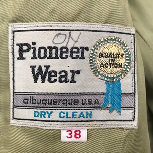 70年代頃のPIONEER WEAR オンブレチェックウールジャケットです。オンブレと呼ばれるグラデーションチェックを使用しています。胸元はフェイクポケットです。ウェスタンウェアを彷彿とさせるフラップやバックヨークが特徴的です。背面はアクションプリーツが入り動きやすくなっております。内側のライニングに所々しみははございますが、全体的にはダメージも無く非常にコンディションの良い1着です。