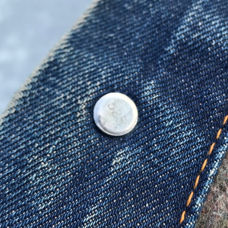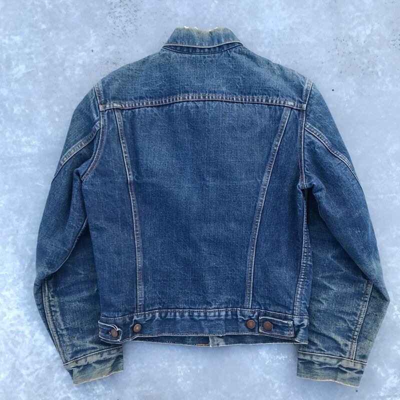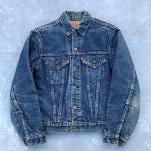 60年代から70年代ころのLEVI'S 70505-0317デニムジャケットです。小紙パッチにケアラベルの付く68年ころから70年代初期頃のモデルです。ボタン裏刻印は525、Big E、不均等V、フラップカンヌキネイビー、袖口裏チェーン、裏地横縞ブランケット。BigEとしての最終期あたりの製造かと思われます。襟と袖口に若干ダメージはございますが、その他裏地も含めて大きなダメージはございません。色残りも7割以上で、両腕のハチノスもメリハリが有り良い雰囲気です。サイズは印字が薄いのではっきりしませんが38と思われます。復刻ではないオリジナルですので、お探しの方は是非。