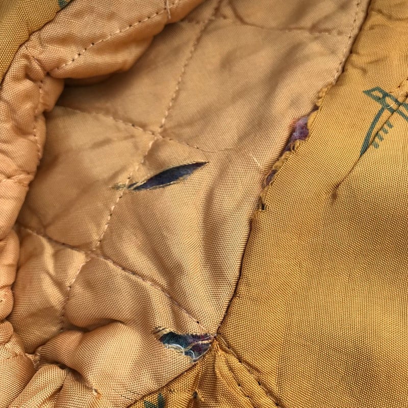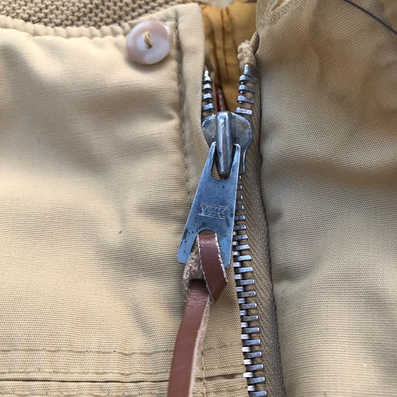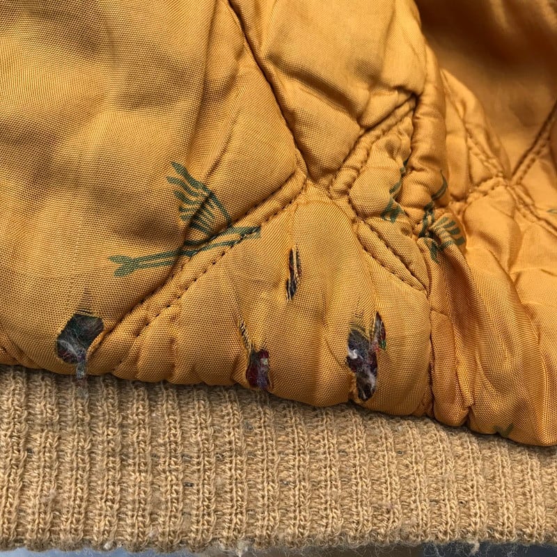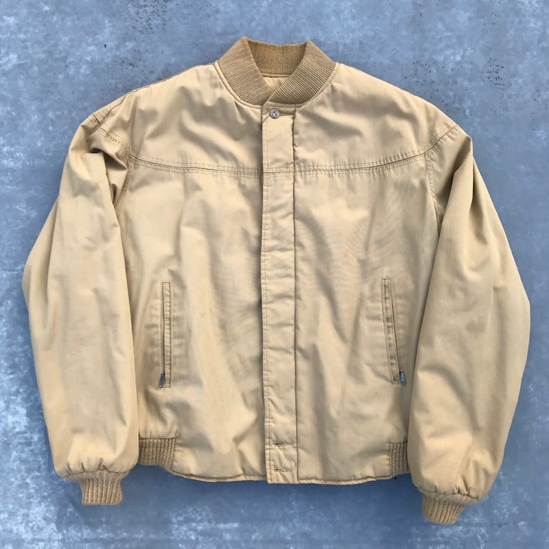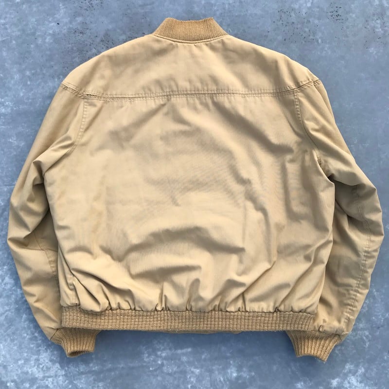 70年代から80年代のVarsity by Catalinaのバーシティージャケットです。サンフランシスコで生まれたダービージャケットにとても似ています。h論とはデカYKKジッパーで裾のボタンが1個欠損しています。袖と裾リブはウール混の通常のリブで首元はコットン地のしっかりとした独特な作りとなります。再度にジッパーポケットは硬めですので開閉には注意してください。首リブと両袖口あたり、内側ライニングに擦れたダメージがございます。表記は46ですが、L位の着用感です。ダービーとは少し違うディティールが楽しめる1着です。