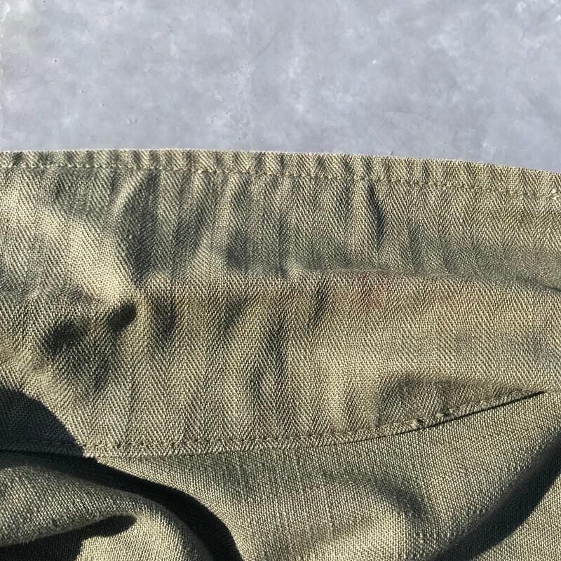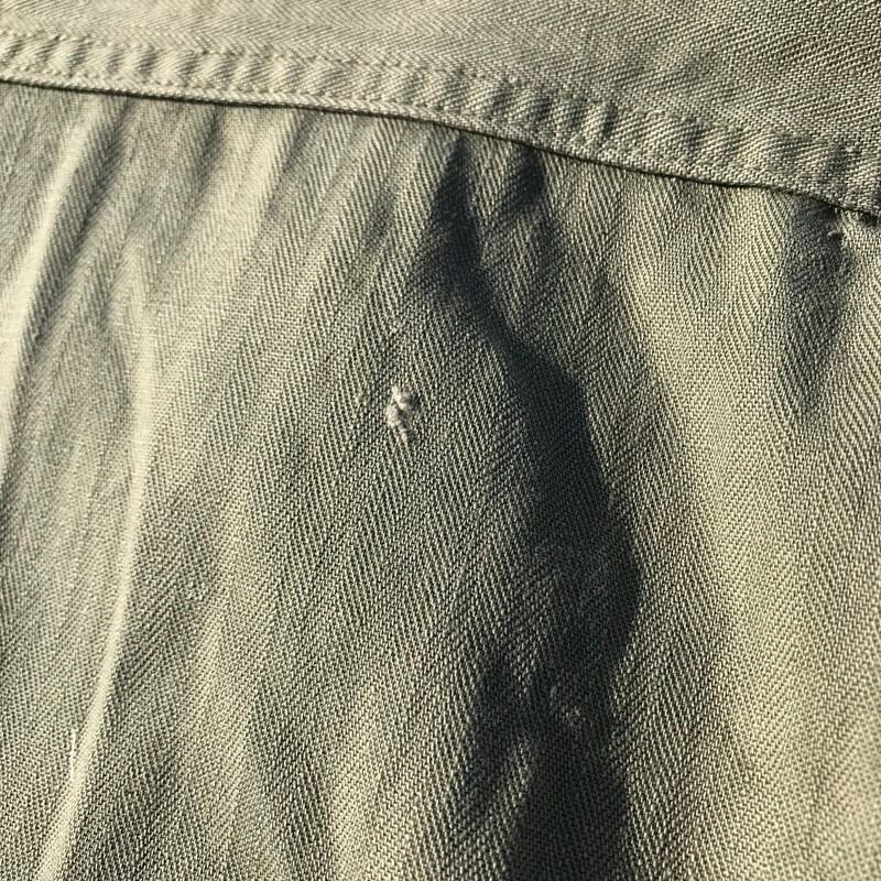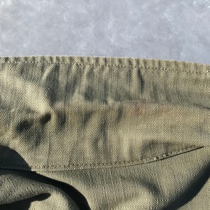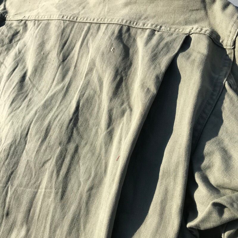 40年代頃のM-42 HBTミリタリージャケットです。張りのあるヘリンボーン生地でラッカー塗膜が施されていたであろう13スターボタンが欠損無く全て揃っています。ウエストにサイドアジャスターが付いた古いタイプです。肩甲骨辺りにちいさなダメージが有り裏側から生地を張り付けて補強されています。襟元に少し汚れがございますがその他は比較的コンディションの良い1着です。サイズはあまり出ない大き目で44から46位と思われます。大き目サイズを探していらっしゃった方におすすめです。