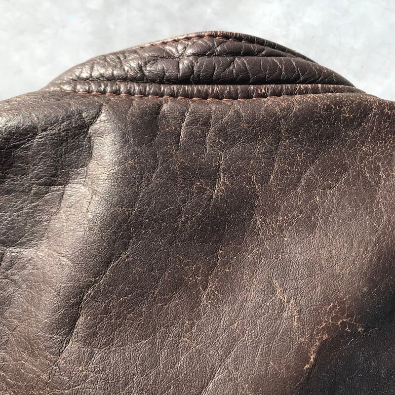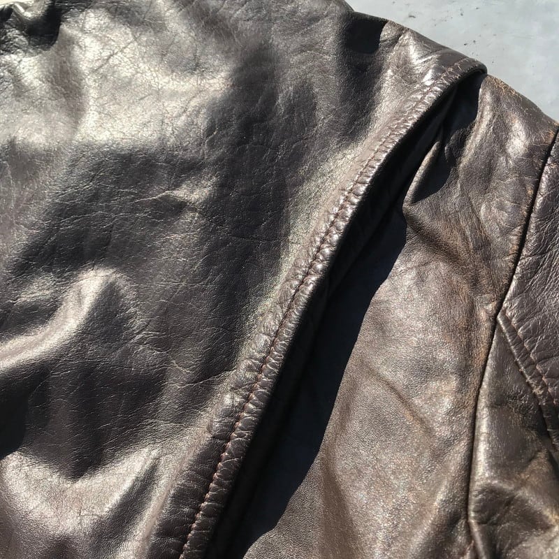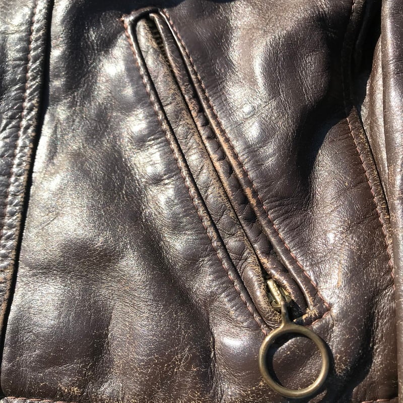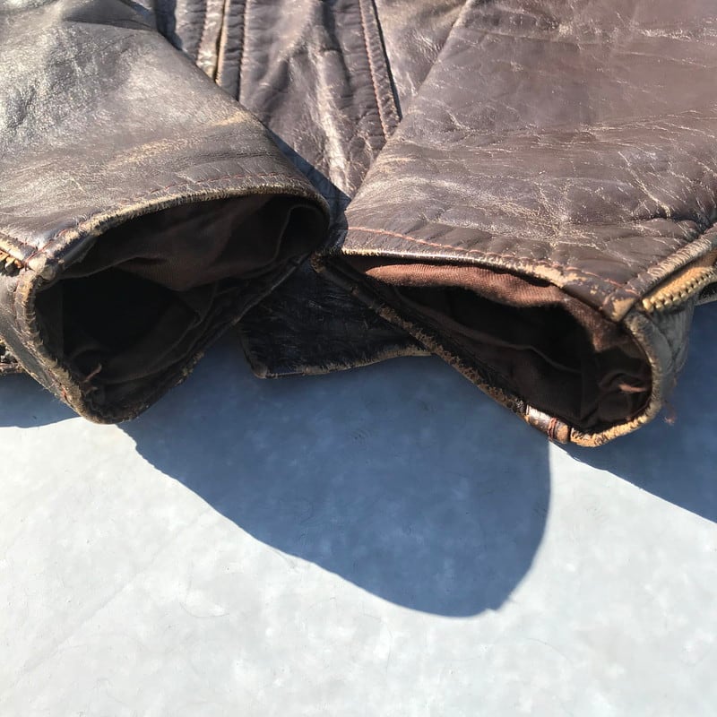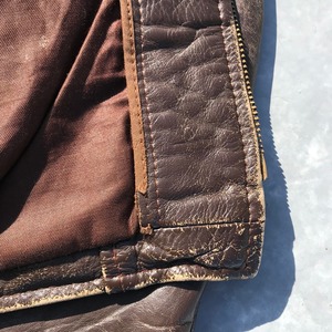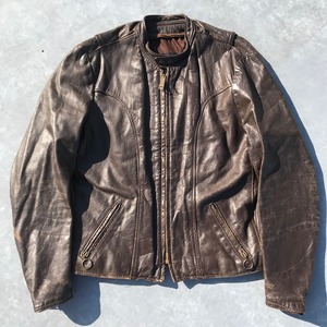 60年代から70年代前半頃のBROOKSシングルライダースジャケットです。モーターサイクルウェアやヘルメットで有名なBUCOのレザージャケットの下請けとして有名なブランドです。フロント、ハンドウォーマーポケット、袖口はTALON社製ジッパーを使用しています。ライナーを取り付けるジッパーが有りますが、ライナーは付属していません。全体に擦れが有り、前立てパイピングに破れございます。マスタングペーストにてオイルメンテナンス済でレザーはしなやかです。ダークブラウンですので、デニムやミリタリーウェアとも相性が良く、シルエットも綺麗です。170cm70kgでジャストです。M(38)位のサイズ感です。