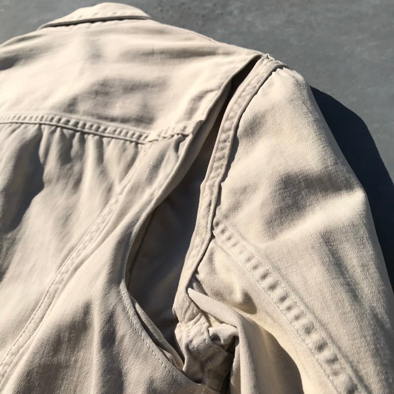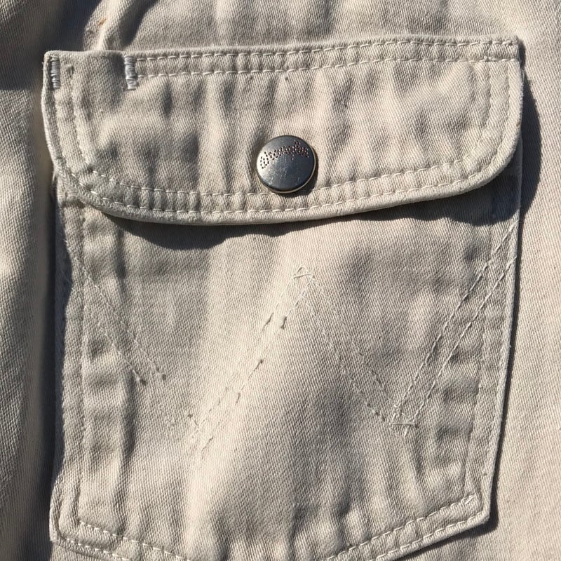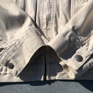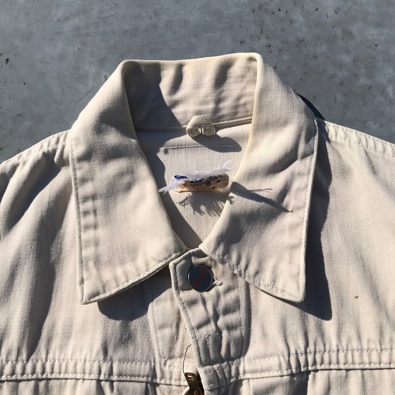 60年代頃のラングラー33MJZコットンジャケットです。11MJZはデニム、22MJZはライトブルーでこちらは33MJZでコットンサテンの生成りの生地を使用しています。Leeでいうウェスターナーに似ています。縦ベル、サイドサイズ表記、®マーク入り。近年復刻されましたがこちらは当時のオリジナルです。サイズ表記40ですが、36~38位の着用感です。所々にシミや汚れはございますが、目立つダメージは無く良好です。女性でも着やすいサイズと思いますので、おススメです。