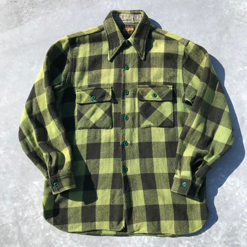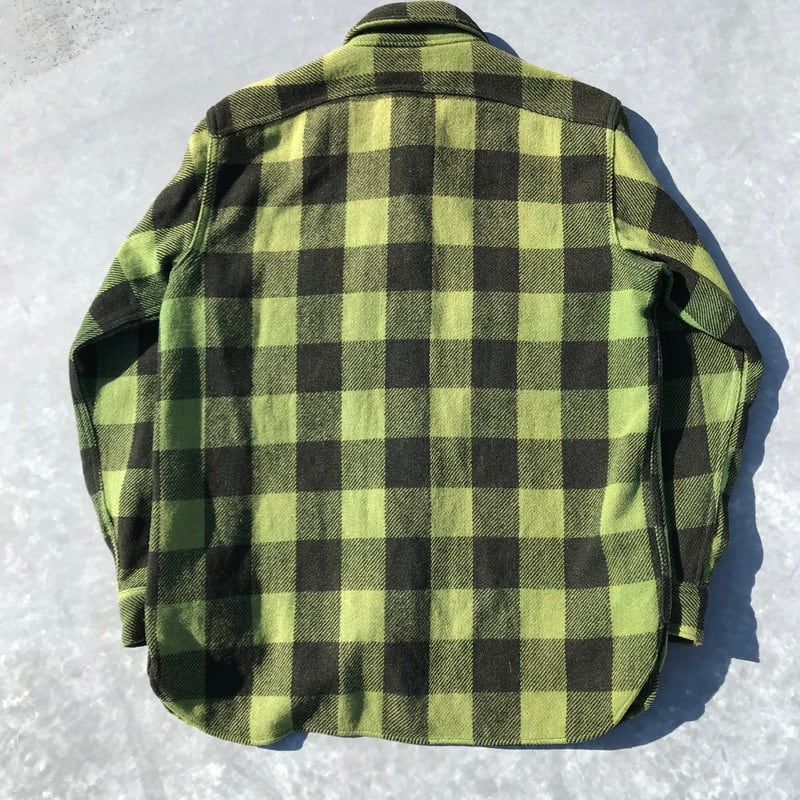 50年代頃のBIG YANK バッファローチェックシャツです。赤黒や、緑黒は見かけますが、黄緑黒はあまり出ないカラーで希少です。首元のサテン地に擦れたダメージはございますがその他目立つダメージや汚れは無くコンディションは良好です。サイドにマチが入るタイプで古着好きには嬉しいディティールです。発色の良いグリーンのボタンも全てオリジナルで付いています。サイズはM~L位です。チノパンなどとも相性の良い色味ですので、バッファローチェック好きは必見のアイテムです。