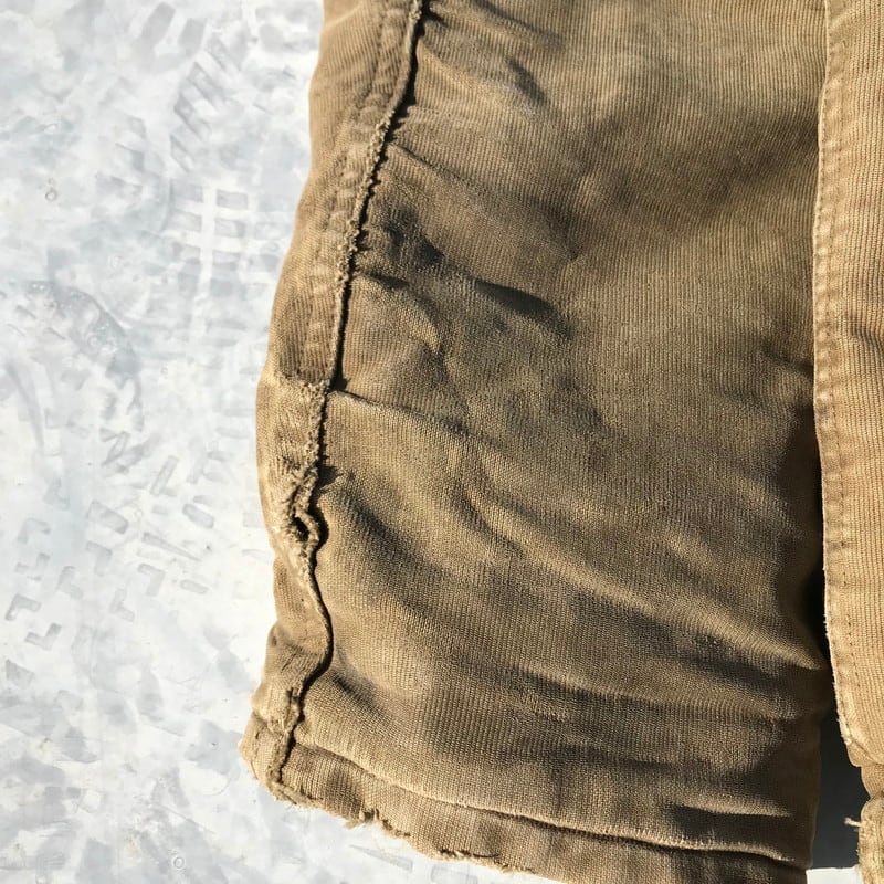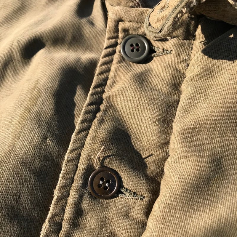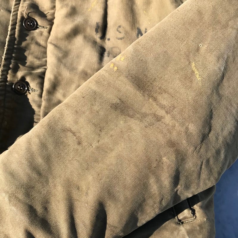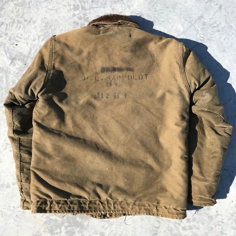 40年代頃のU.S.NAVY N-1デッキジャケットです。米海軍の甲板上での作業用として知られ、USNでは1番の知名度を誇るアイテムです。ネイビーカラーからカーキボディに移行したのが1944年頃、こちらはNXsx表記で袖先にアルパカが使用されていないので45年コントラクトの後期型と思われます。裏地は100%アルパカライナーです。襟元などに少し抜けもありますが、保温性は抜群です。ジッパーはアルミデカジッパーへと変更されていますので、開閉はスムーズです。全体に汚れや小穴などのダメージがございます。トップ2つボタンの色が違います。胸元と背面のステンシルが無骨な雰囲気を醸し出していてかっこいい1着です。ダメージ等を楽しめる方におすすめなアイテムです。