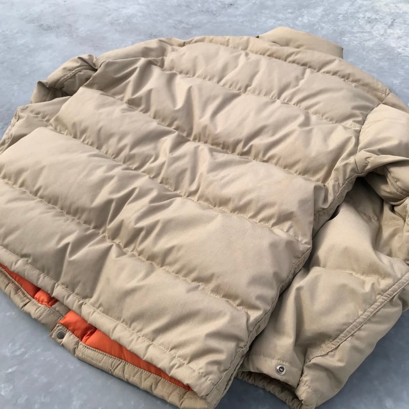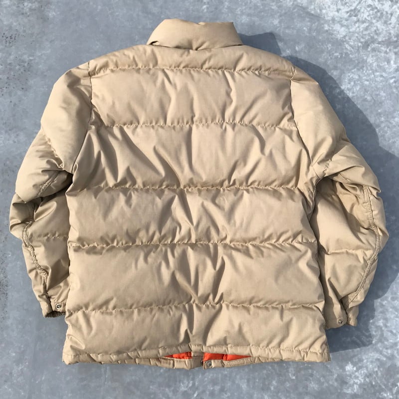 70年代から80年代頃のTHE NORTH FACEダウンジャケットです。日本で取り扱われる以前のオリジナルです。茶タグで生産国表記はございませんがUSA製と思われます。60 40クロスの様なコットンナイロン地でしっかりとしています。フードは当時別売りだった為、欠損しているのでは無くはじめから付属していません。フロント中央にシミがございますが、洗濯等で薄まると思われます。所々に小さなシミはございます。ベージュ×オレンジのクラシカルなカラーリングも良くダメージ等も少ない美品ですので、お探しだった方必見です。