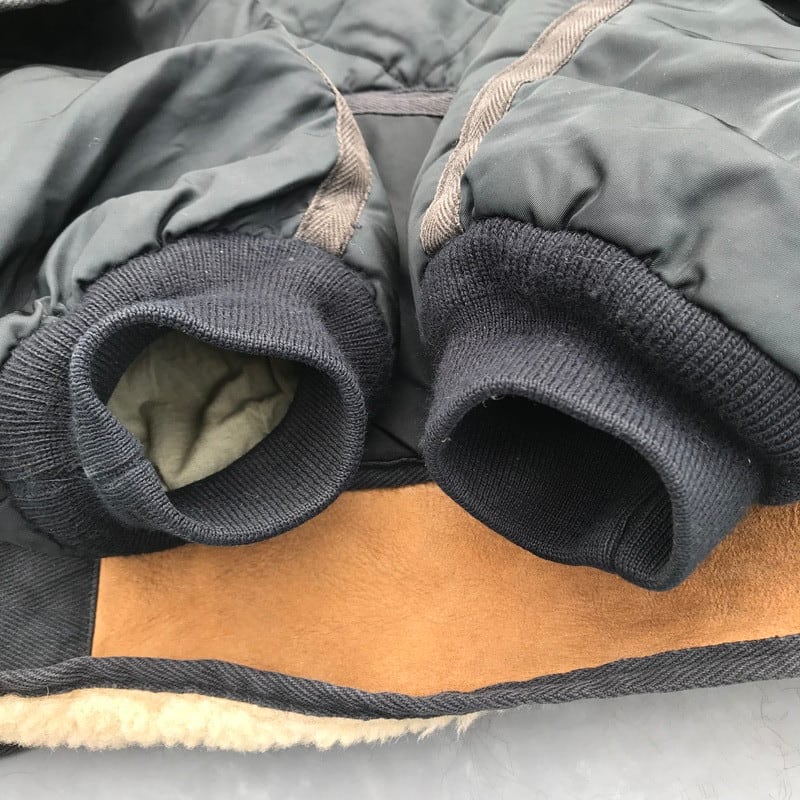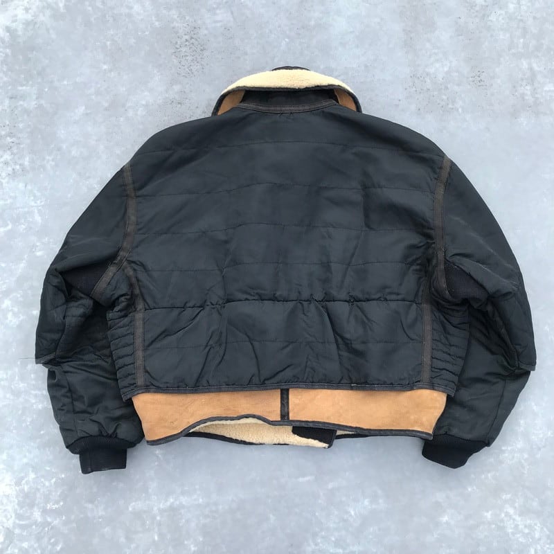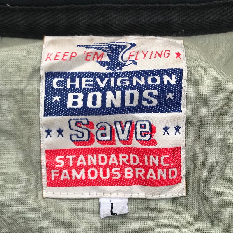 CHEVIGNONのボンバージャケットです。1979年にフランスで創業したアパレルブランドです。こちらのボンバージャケットはフライトジャケットを再構築したようなデザインが特徴で古着市場でも人気のアイテムです。襟とウエスト周りにムートンが取り付けられていて、レイヤード風な作りもとても興味深い1着です。大きなダメージ等はございませんが小さなダメージが右胸辺りに見られます。94年にNFAグループに買収された事から80年代から90年代頭頃に作られたモデルと思われます。市場でもあまり出ない名品ですので、お探しだった方は是非いかがでしょうか。