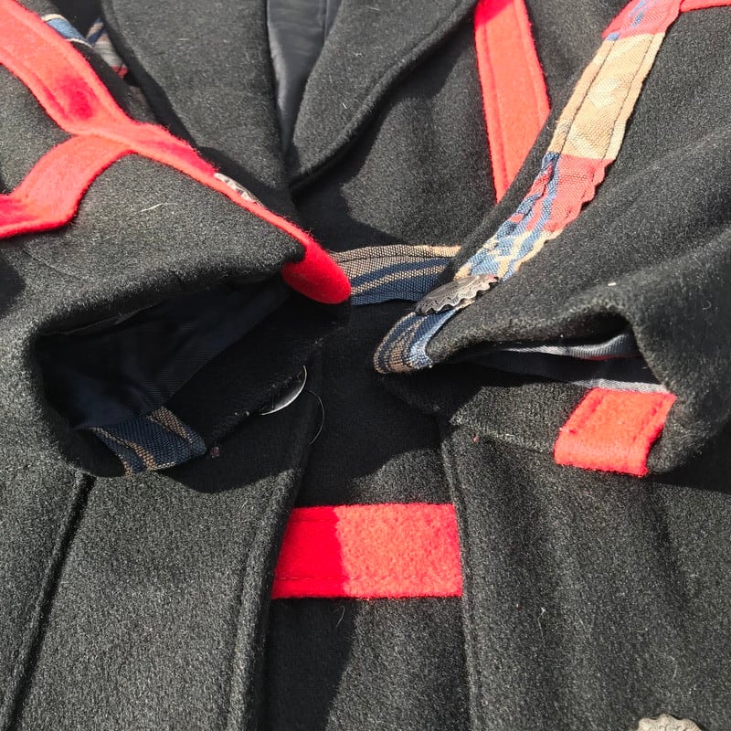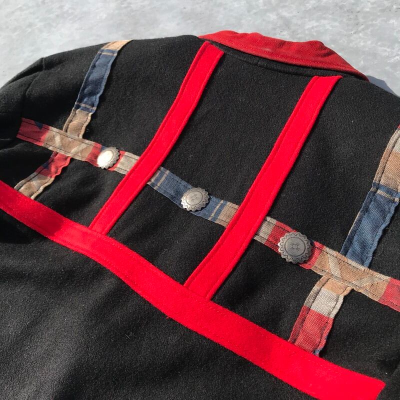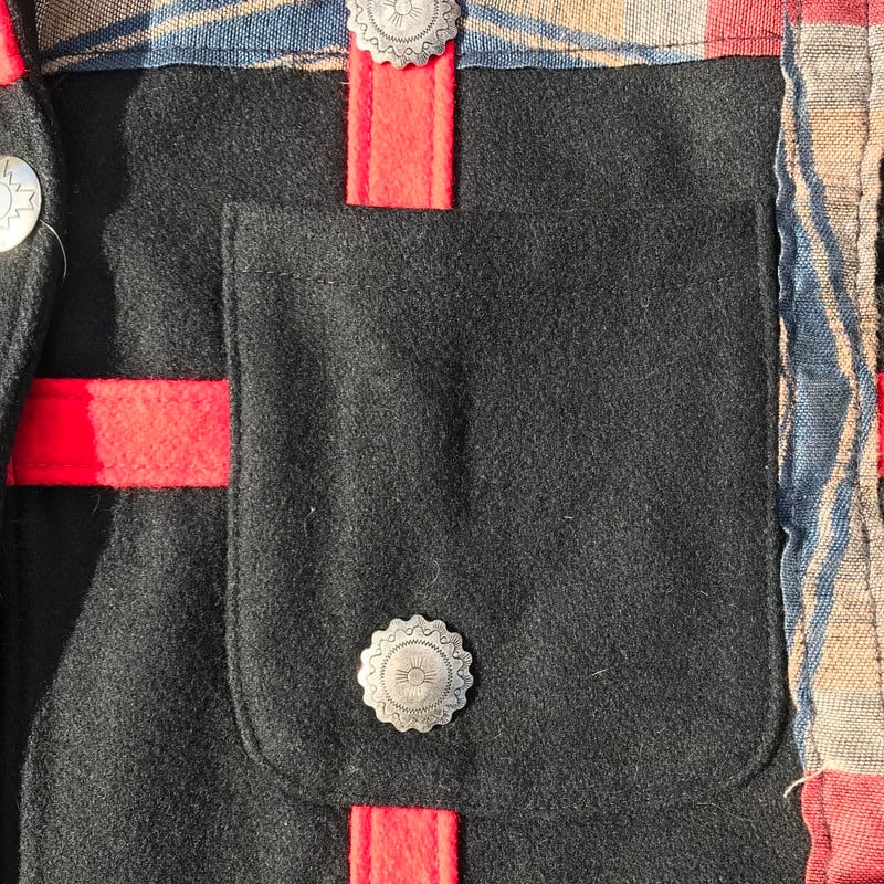 80年代頃のPIONEER WEARウールジャケットです。この年代には様々なインディアンジャケット等を手掛けたブランドですが、こちらは、ネイティブ柄の生地が縦横に入り、交差部分やフロントはコンチョボタンが使用されたとても珍しいデザインの1着です。襟はスエードが使われております。ボタンはレディース合わせで、肩パットも入っていますが、サイズはメンズのM位です。人と被りたくな方には大変おススメです。