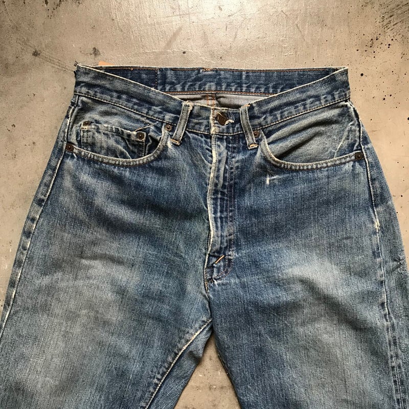 60年代頃のLEVI'S 505Big Eです。トップボタン銅色、トップ裏刻印8、ウエストチェーン、42TALON、バックポケット裏シングル、アウトシーム両面シングル、Big E、不均等V。ウエストはW31相当で、色残りは4~5割。ベルトループにダメージ有り。左バックポケット横にリペアがありますが、その両側が破れています。その他右ひざアタリにリペア有、小さな汚れや擦れなどございます。505らしくテーパードの入った綺麗なシルエットでバックポケットも501に比べ角張っております。春のコーディネートに使いやすい色落ちですので、サイズの合う方は是非いかがでしょうか。