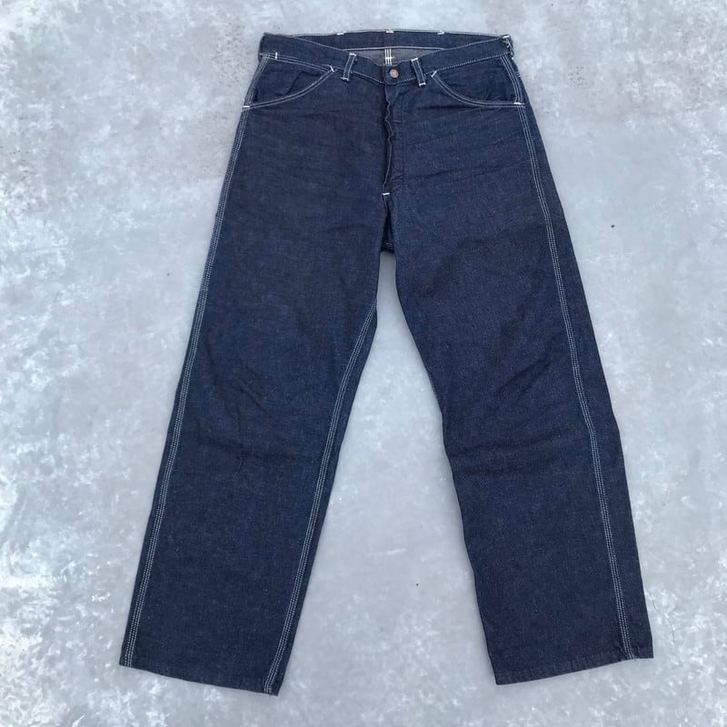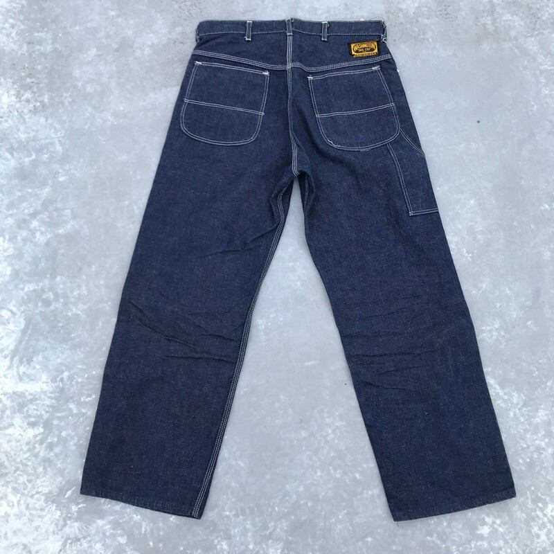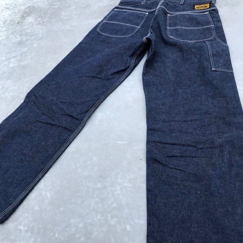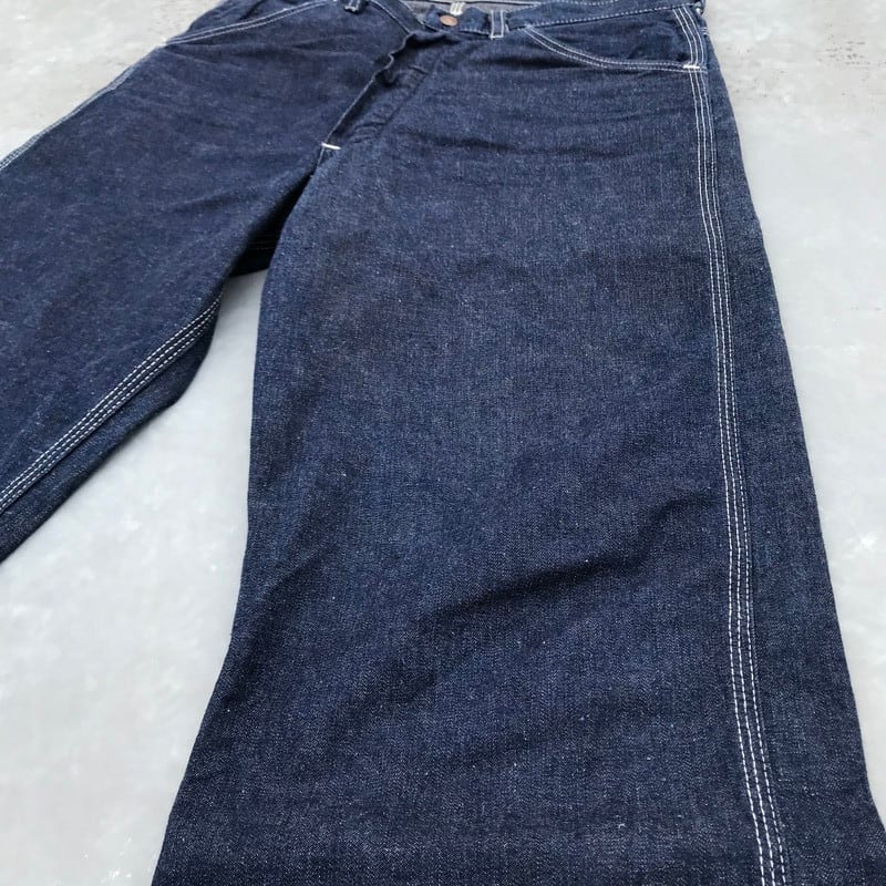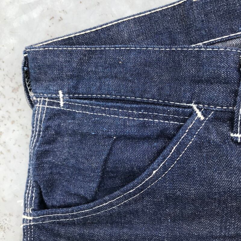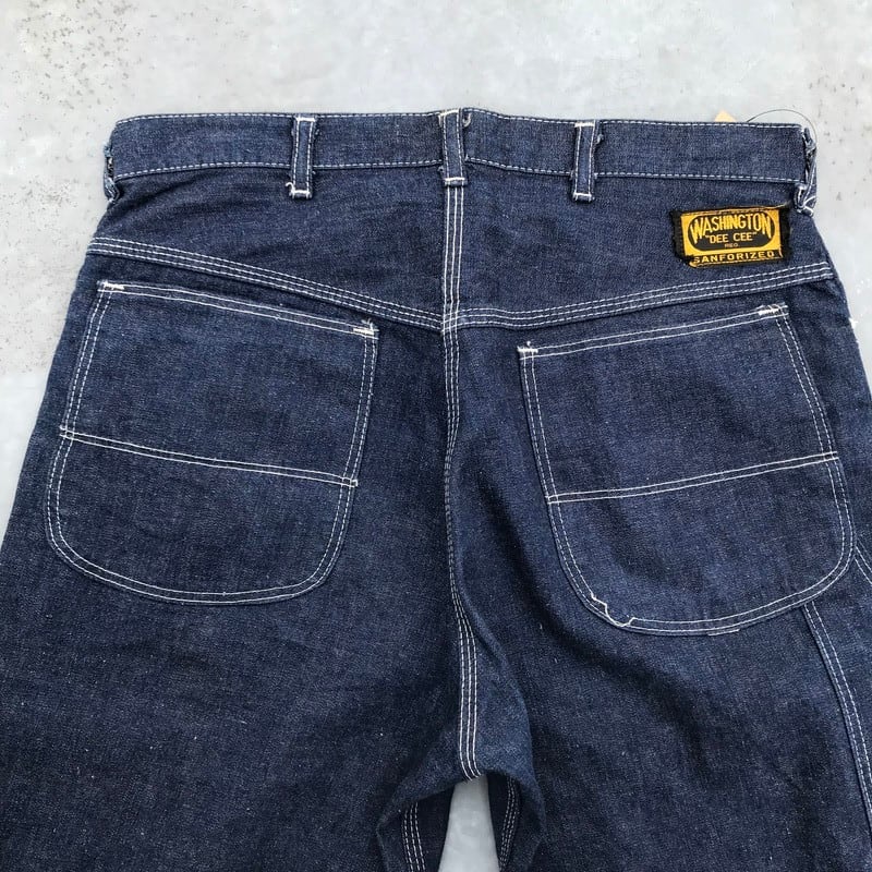 60年代頃のWASHINGTON DEE CEEデニムペインターパンツです。ワークウェアで有名なこちらは100年以上前に創業し今も現存するワークブランドです。サイズは実寸W34位で履きジワはあるもののダメージも無い真っ紺のミントコンディションです。恐らくデッドストックをおろして1~2回ほどしかウォッシュされていない物と思われます。バックポケットにステッチほつれしている箇所がございます。サイズも状態も良いペインターパンツは探すのが難しくなってきていますので、サイズがドンピシャな方は是非!