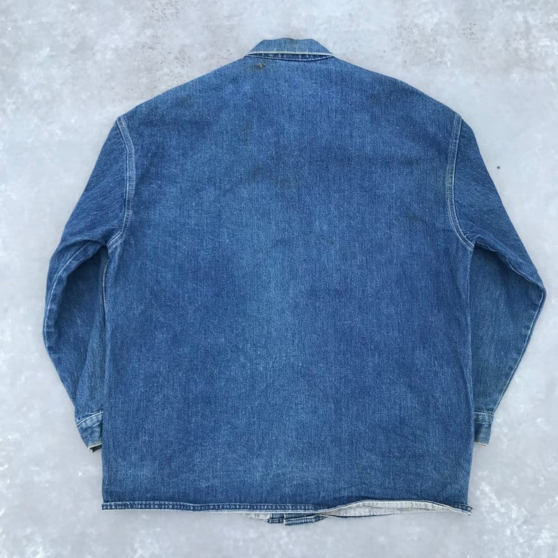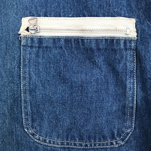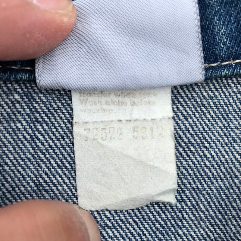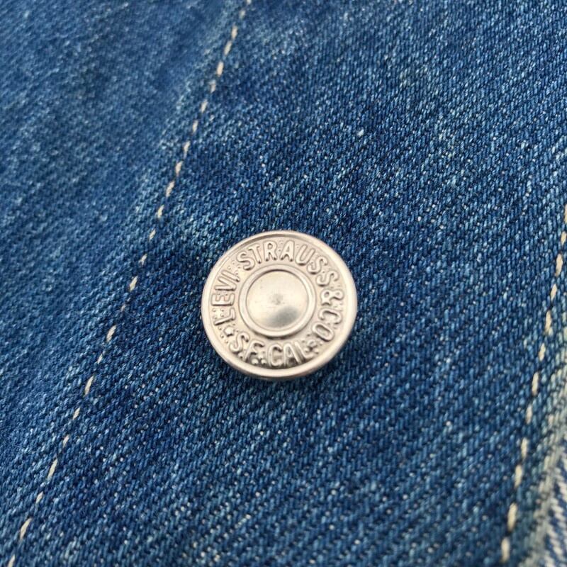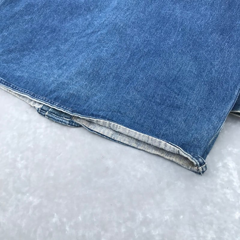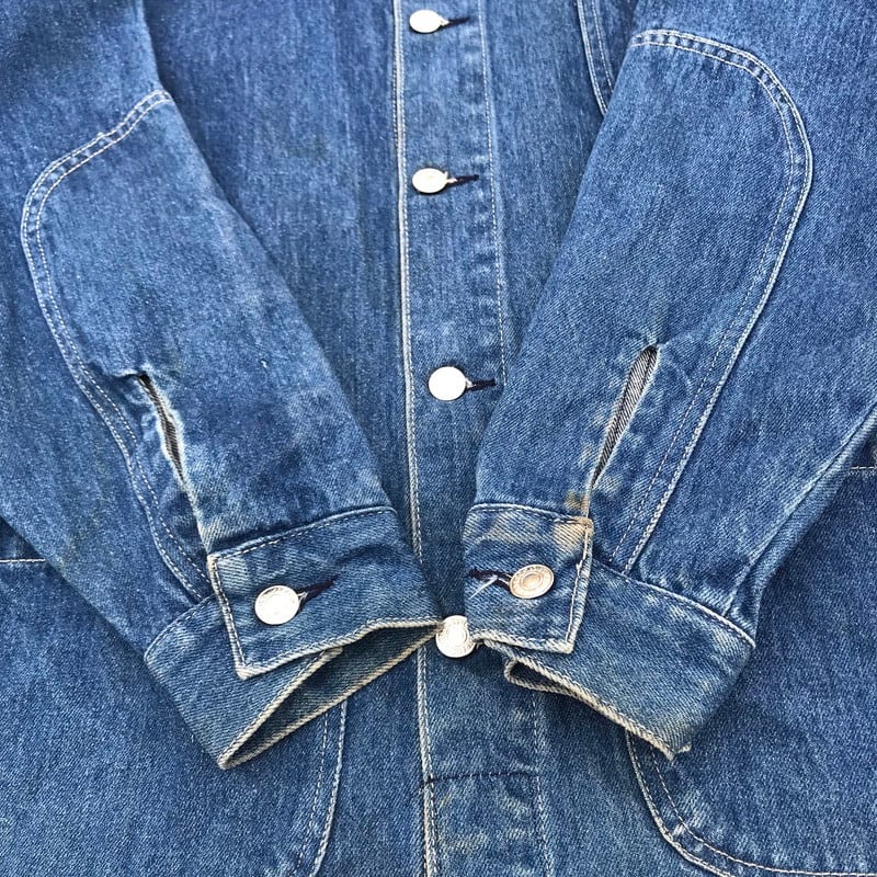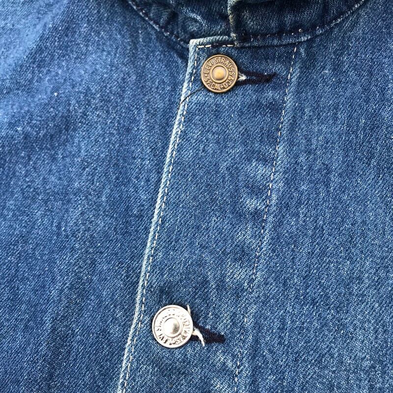 80年代初頭頃のLevi'sデニムカバーオールとなります。ファッショナブルなワークウェアラインとして70年代頃から製造されたMOVIN'ONというシリーズです。当時プロモーションCMも作成され、力をいれていたラインのようですが、80年代頃のアイテムはなかなか古着市場では見つけにくく、こちらのカバーオールはその中でもかなり希少な1着です。タグにもリーバイスと表記されないので非常にわかりにくいですが、ボタンには刻印されております。首元に色落ち、内側背中あたりにシミがございます。色残りは5割程で大きなダメージは無く、状態は良好です。リーバイスのカバーオール自体数も少ないのでお探しの方は是非いかがでしょうか。【肩幅】61cm【身幅】66cm【着丈】81cm【袖丈】56.5cm