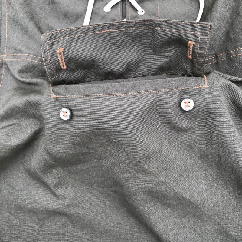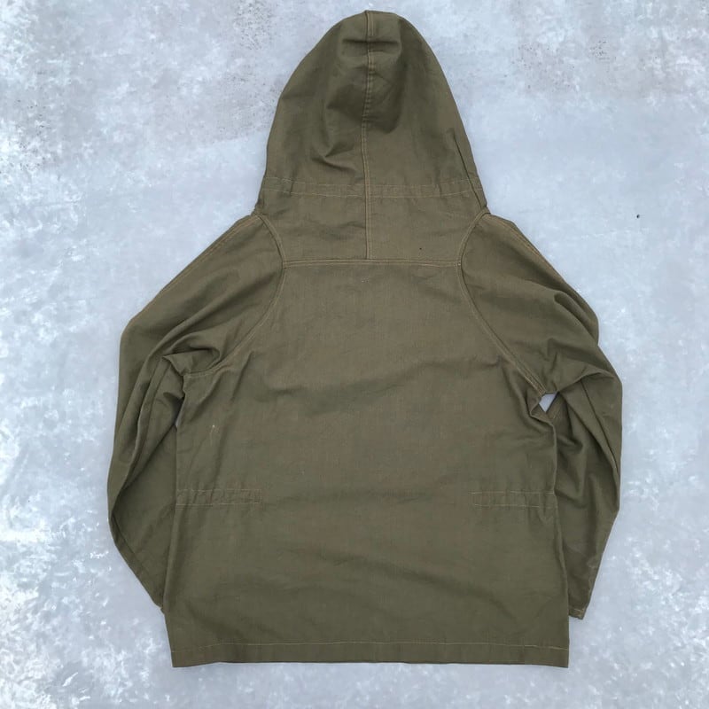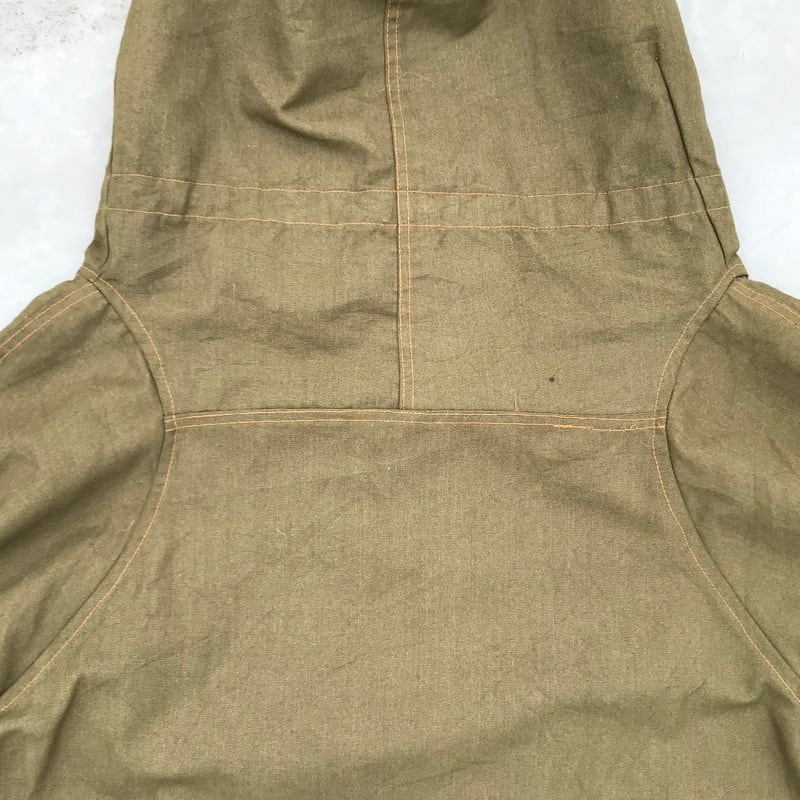 80年代から90年代頃に製造されたと思われるPOLSPORTとうブランドのレースアッププルオーバーパーカーです。ポーランドのメーカーのようですが、マイナーな為か詳細は不明です。ユーロのミリタリーアイテムを彷彿させるデザインで、独特な袖付け方をしています。素材は60/40クロスの様な生地です。フード内側やウエスト辺りにあるステッチはドローコードではなく補強の為と思われます。170cm70kgで程よくジャストです。春先に使いやすいアイテムですのでおススメです。