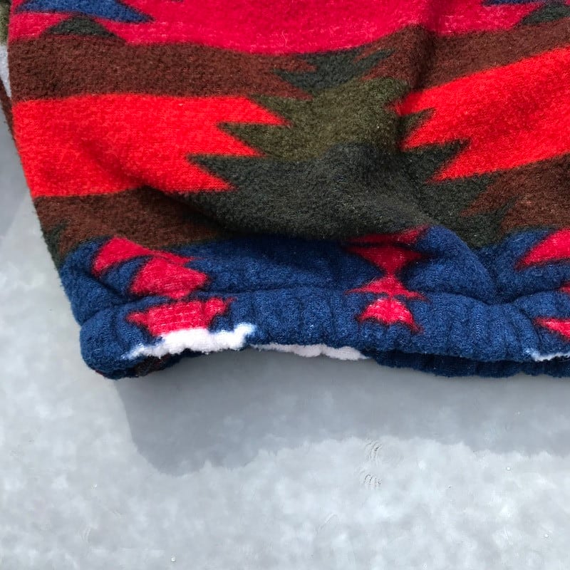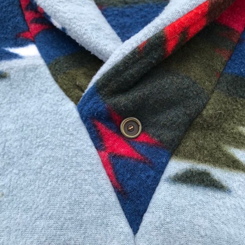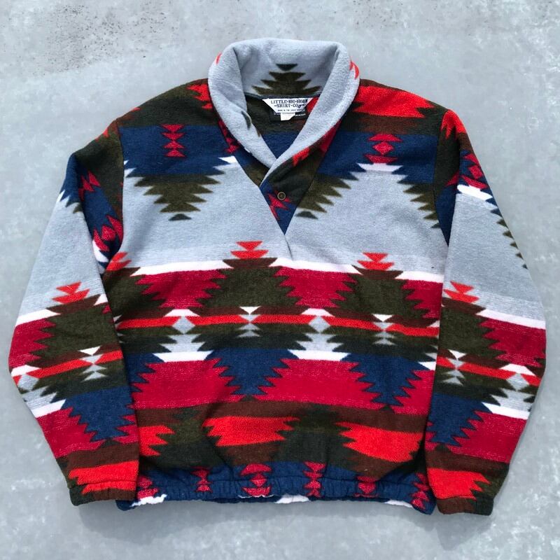 90年代頃のLITTLE BIG HORN SHIRT COというメーカーのショールカラーフリースジャケットです。ネイティブ柄で目を惹く1着です。本来ならフロントショールカラー下中心にボタンで留めるフリンジのような物が付属しているのですが、こちらのアイテムでは欠損しております。ボディのサイド縫い目に沿ってポケットがございます。全体に使用感はございますが、目立つ汚れやダメージはございません。身幅のゆったりしたLサイズです。カバーオール等のインナーにいかがでしょうか。