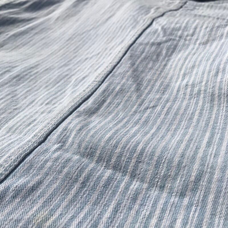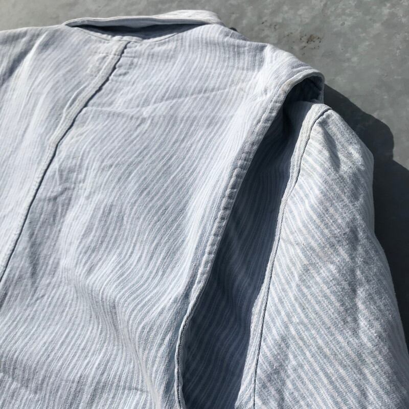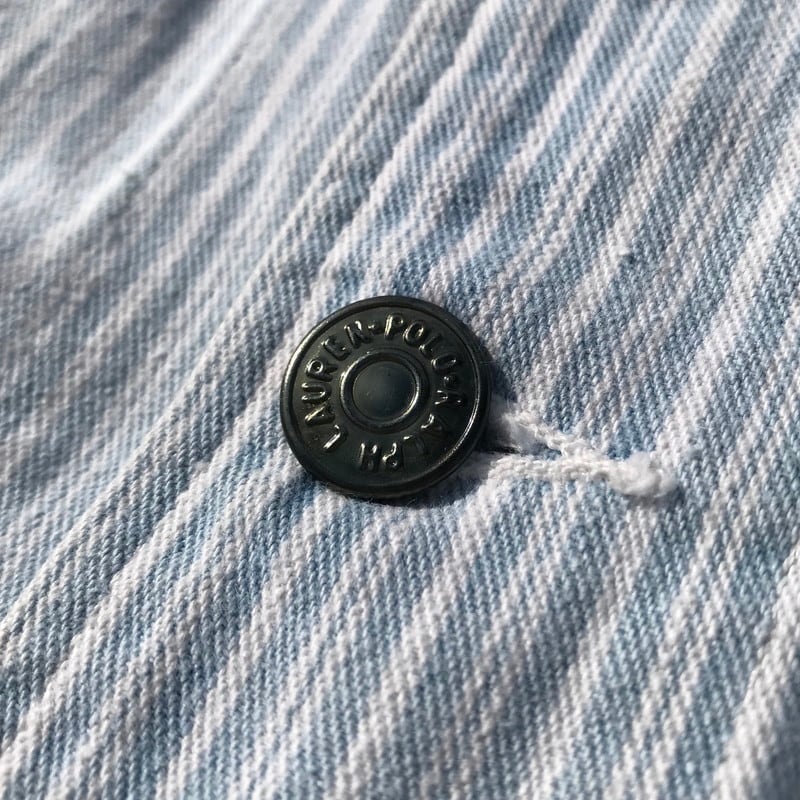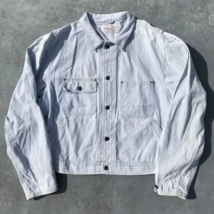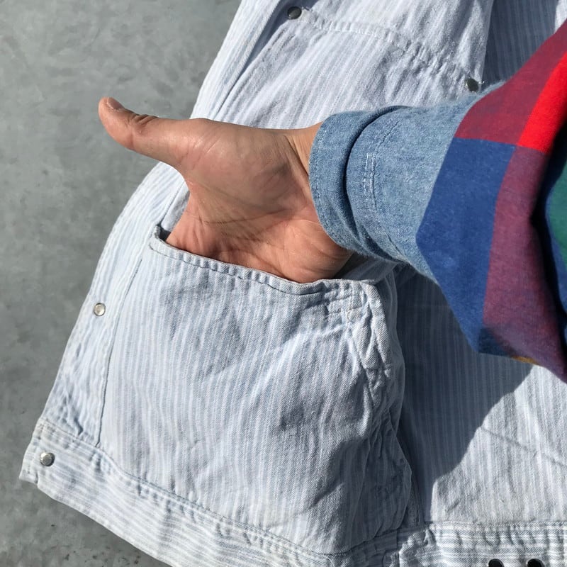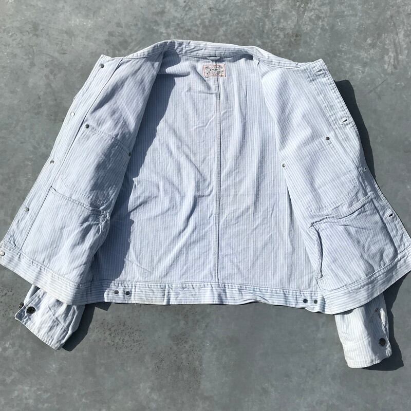 80年代から90年代頃のPOLO RALPH LAURENヒッコリージャケットです。旧タグの白タグの付く今では希少な1着。親子ヒッコリーと呼ばれるストライプで、淡い色味が特徴的です。身幅は広く袖丈は長い作りです。エンジニアジャケットのようなショート丈で、腕周りにアクションプリーツが入りますので動きやすい構造となります。全体に使用感があり、所々ペンキ飛びや薄汚れがございます。ワークウェアらしい雰囲気がお好きな方に大変おススメです。