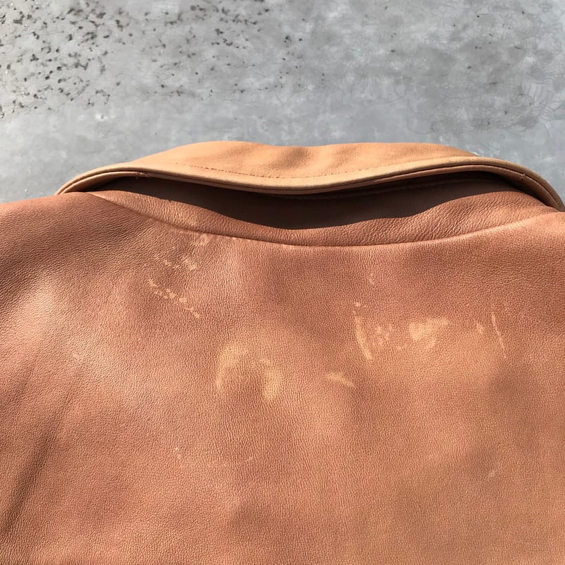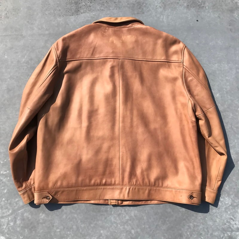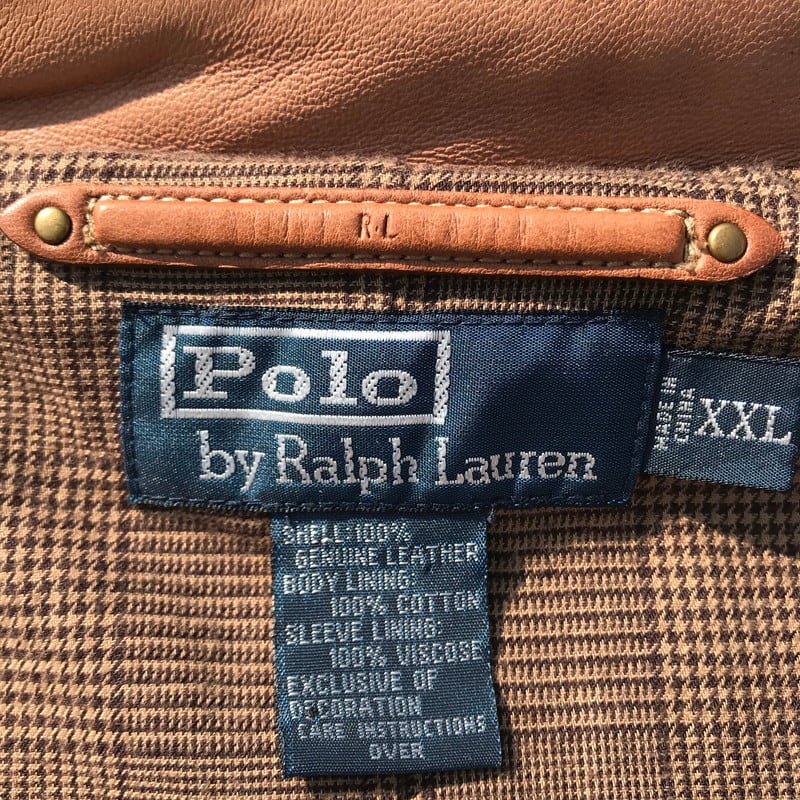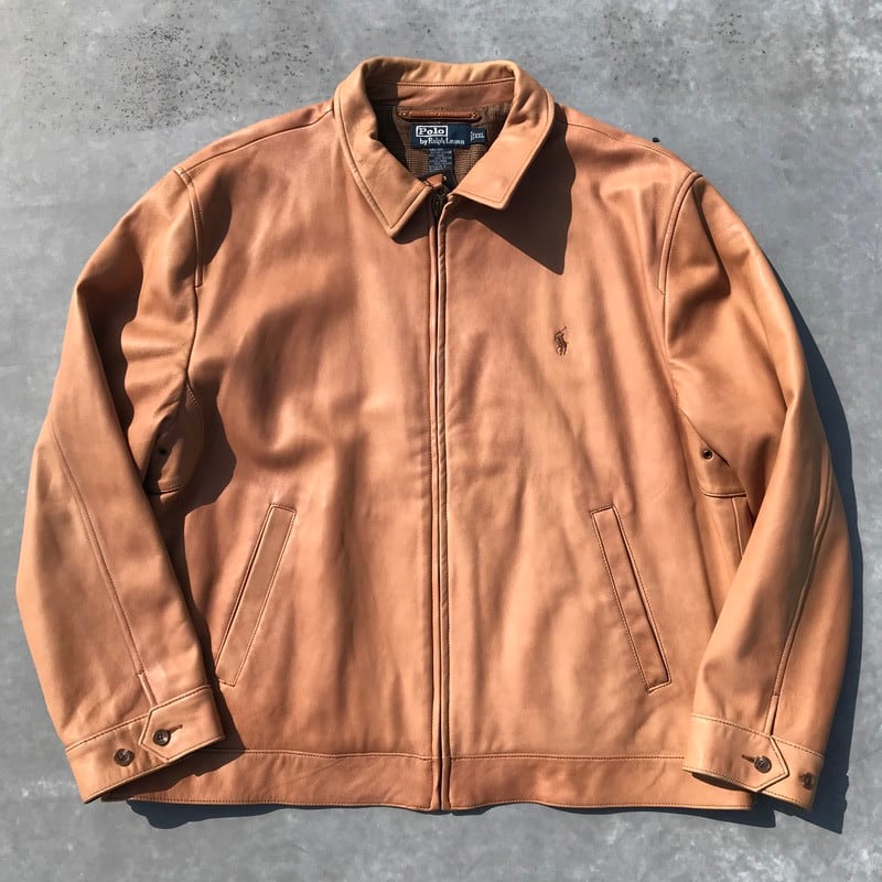 ポロラルフローレンラムレザージャケットです。しなやかなラムレザーを使用しておりヌメ革のようなナチュラルなカラーが春先も使いやすいアイテムです。袖周りや首元付近のヤケのような変色や色飛びなどございますが、オイルメンテナンス等で馴染ませることが出来そうです。サイズはXXLとビッグサイズですが、元々着丈の短めなスウィングトップタイプですのでトレンドっぽい着こなしにお勧めです。背中がLEVI'S506XXファーストのでかいサイズのみ施されるTバックのようなステッチが古着好きにおすすめです。定価は10万円近くしますので大変お買得です。