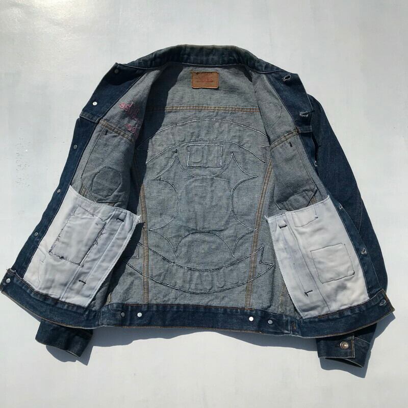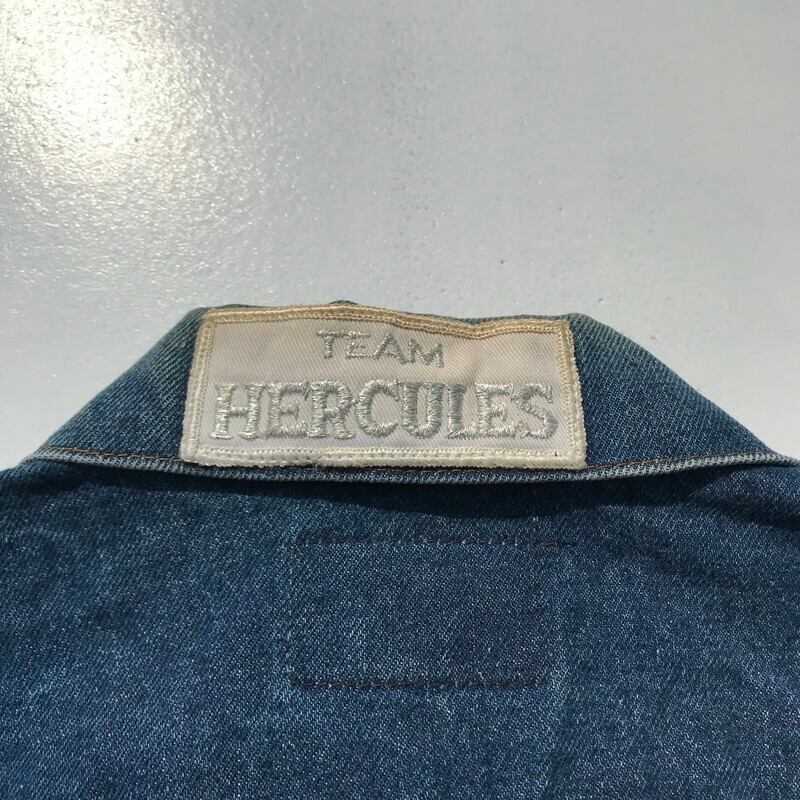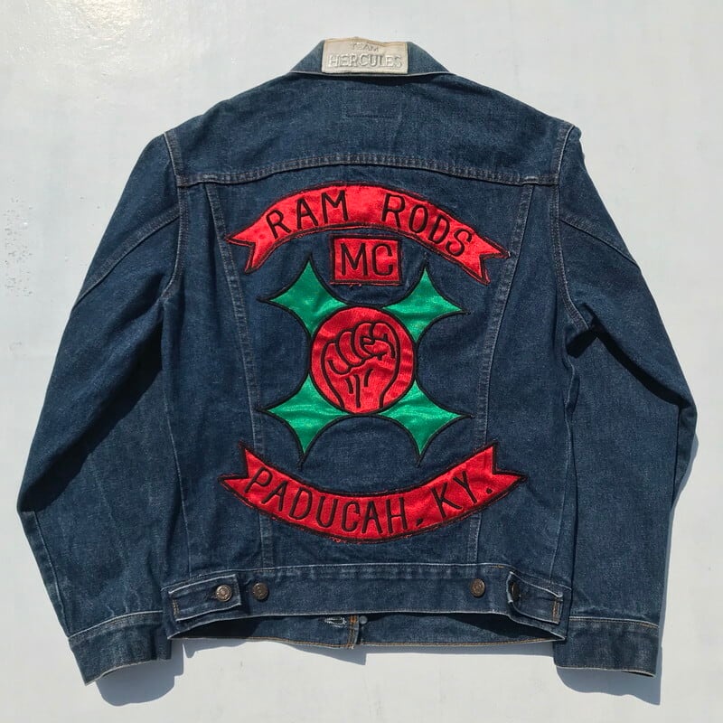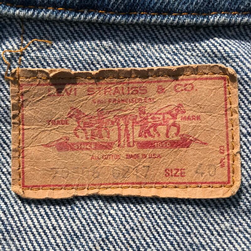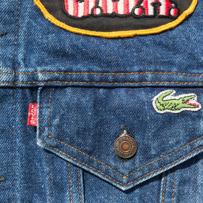 80年代から90年代頃のリーバイス70506です。70505にハンドウォーマーポケットが付くタイプで、ボタン裏刻印は527。全体にワッペンがカスタムで取り付けられており、背面はRAM RODS CAR CLUBのワッペンが施されております。両サイドのポケットは縫いつけられているので、使用できません。色味はまだ濃いめで、サイズも40とゴールデンサイズですので、おススメです。ラコステのワッペンと、右腹のON,OFFスイッチのワッペンがNICEな1着です。