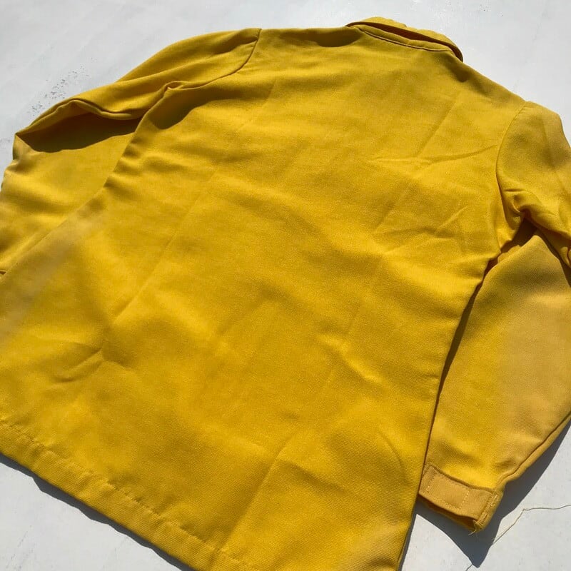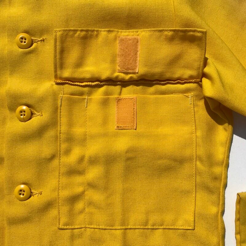 90年代初頭頃のUSDAFSアラミドユーティリティーシャツです。USDAFSとはアメリカ合衆国森林局を意味しており森林警備等を管轄する部署です。山火事等に備え難燃繊維であるアラミドを採用し、森の中での視認性を考慮したような鮮やかなイエローをしています。市場に出る事が非常に稀で滅多に見かけない珍品と言えます。袖口やフラップはグローブを着用していても扱いやすいようにマジックテープ仕様となります。両袖や背中左側等にヤケによる褪色が見られますが、ダメージは殆ど無く良好です。Sサイズ表きですが、M位の着用感です。タウンユースとしてや、コレクションにもおススメな1着です。