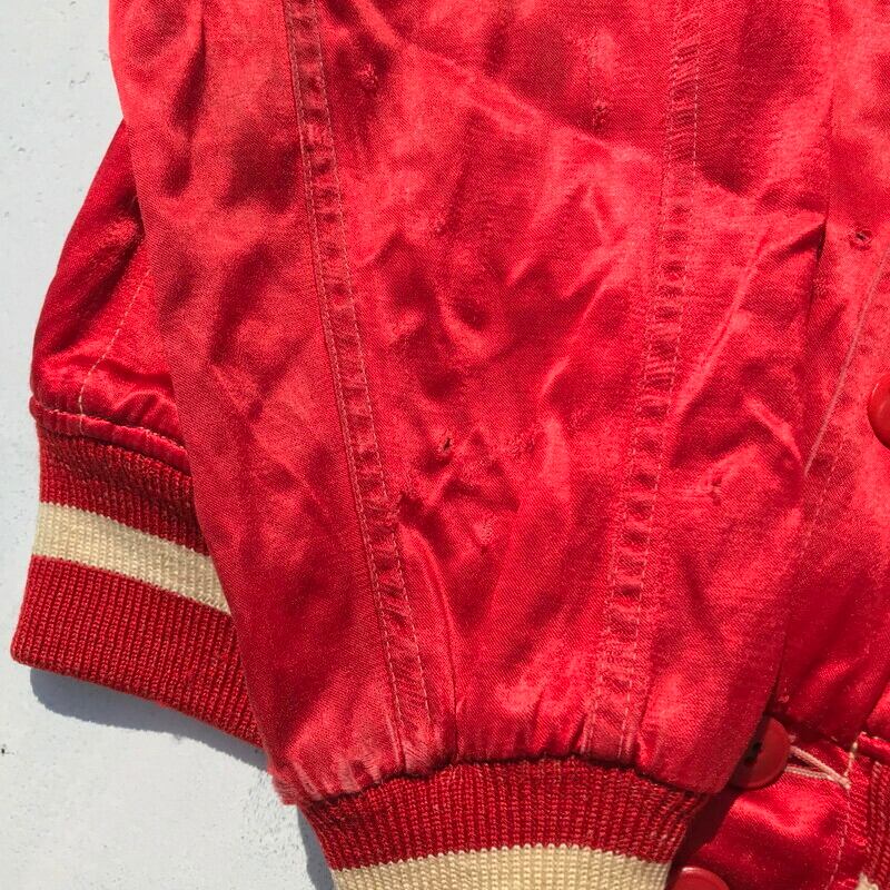 40年代頃と思われるサテン地のボタンスタジャン、通称”ボタスタ”です。鮮やかなレッドのサテンで胸元にはインディアンモチーフのワッペンが施されています。ボディや袖付近に小穴のダメージが見られます。袖リブにも少しダメージがございますが、年代を考慮すると比較的良好と思われます。ボタンが1箇所同じ素材の猫目ボタンに替えられています。1見派手めですがデニムパンツとの相性は抜群で、シンプルなトップスの上にさらっと羽織るととてもかっこいいアイテムです。