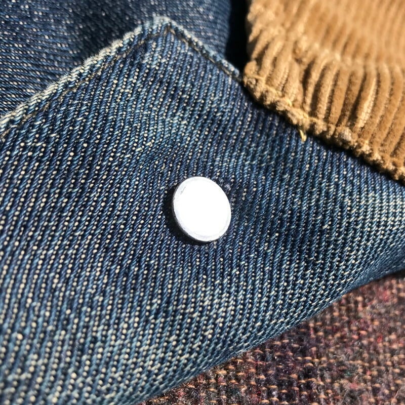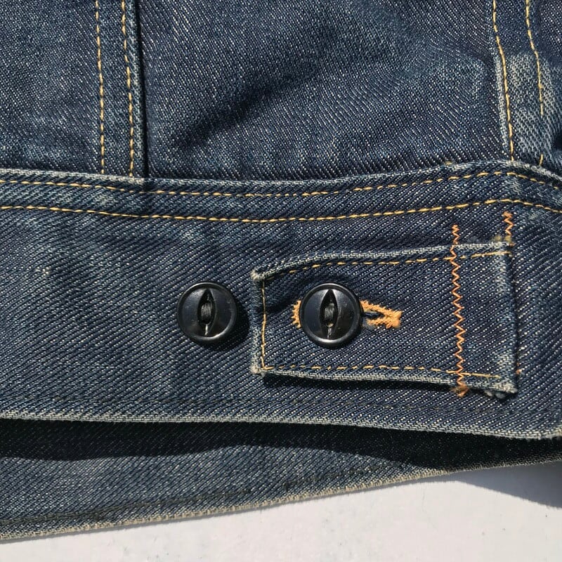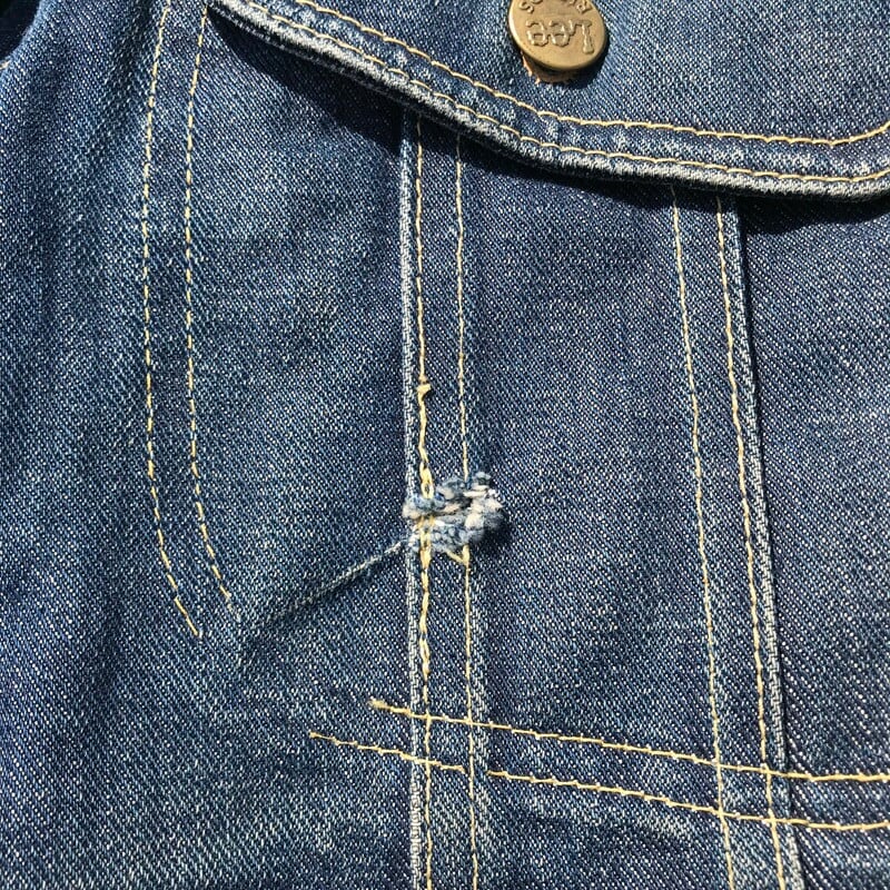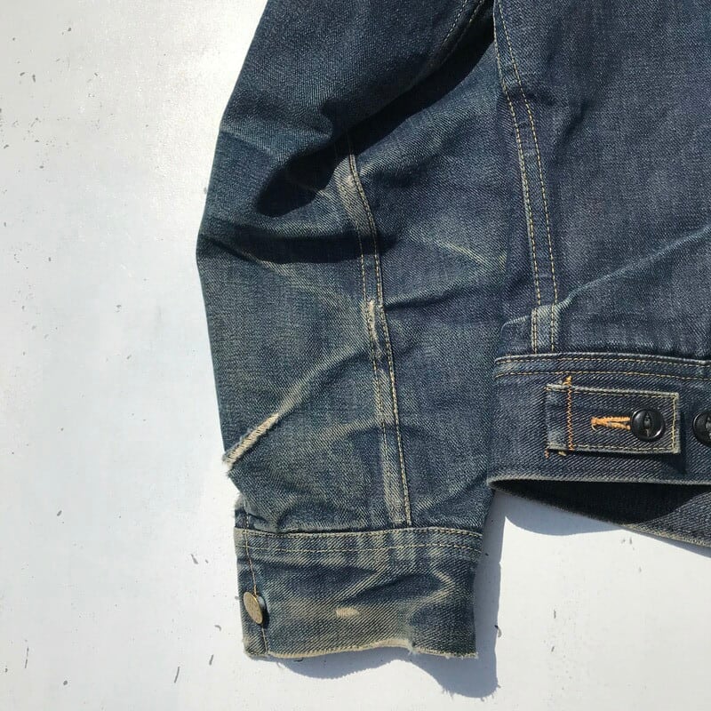 60年代から70年代初頭頃のLee101LJストームライダーデニムジャケットです。胸元のピスネームは®マークのみで、首タグにはMRも記載されていますので、70年代頭にかけての過渡期のモデルと思われます。古着のストームライダーは褪色している個体が多いですが、こちらは非常に濃く、メリハリの付いたアタリも見られます。両袖のヒゲも未五体十分です。胸元、ボタン付近、袖口にダメージがございますが、リペア可能であり、ヴィンテージならではの雰囲気に合っていますので気にはならないかと思います。裏地のブランケットも綺麗に残っています。サイズは36ですので女性も着用しやすいです。良い色落ちを着たい出来る1着です。