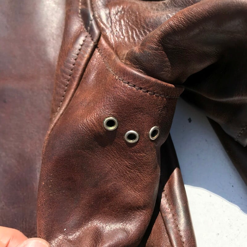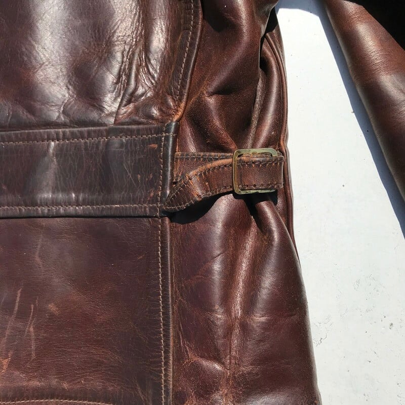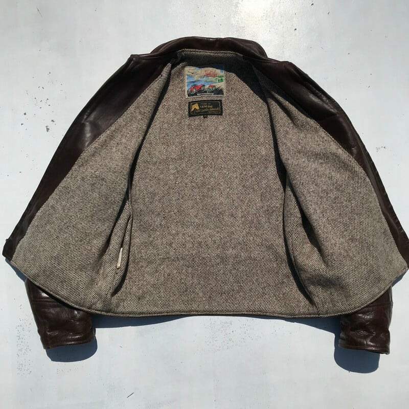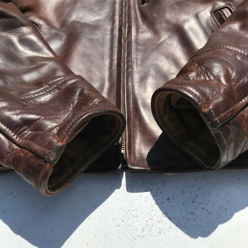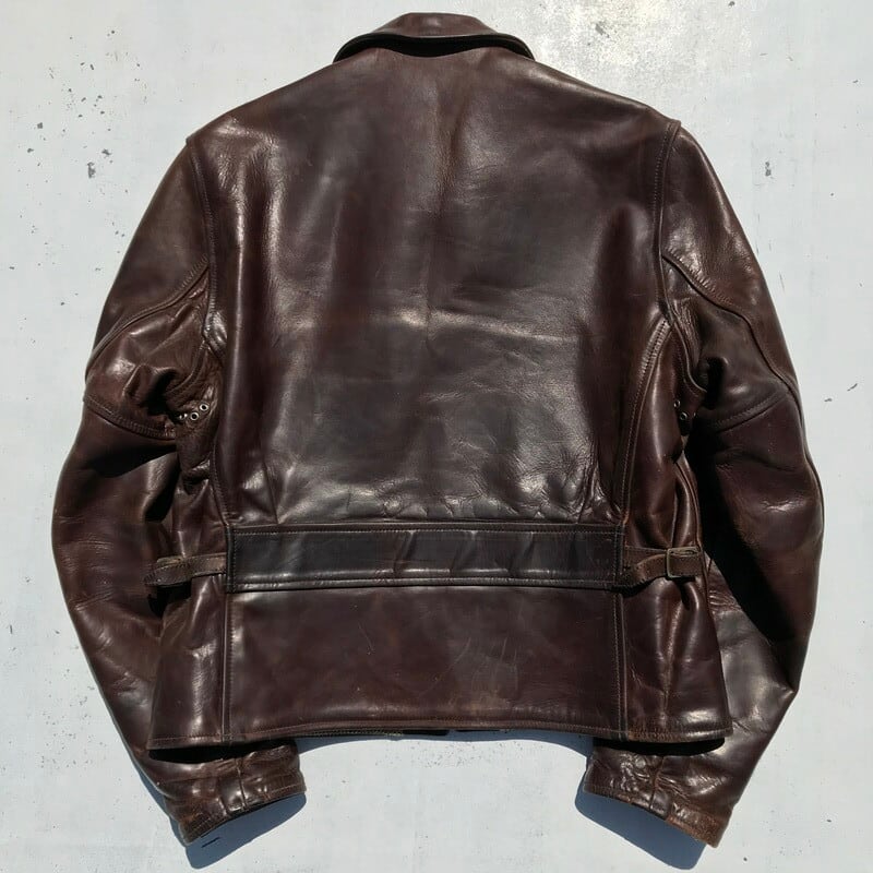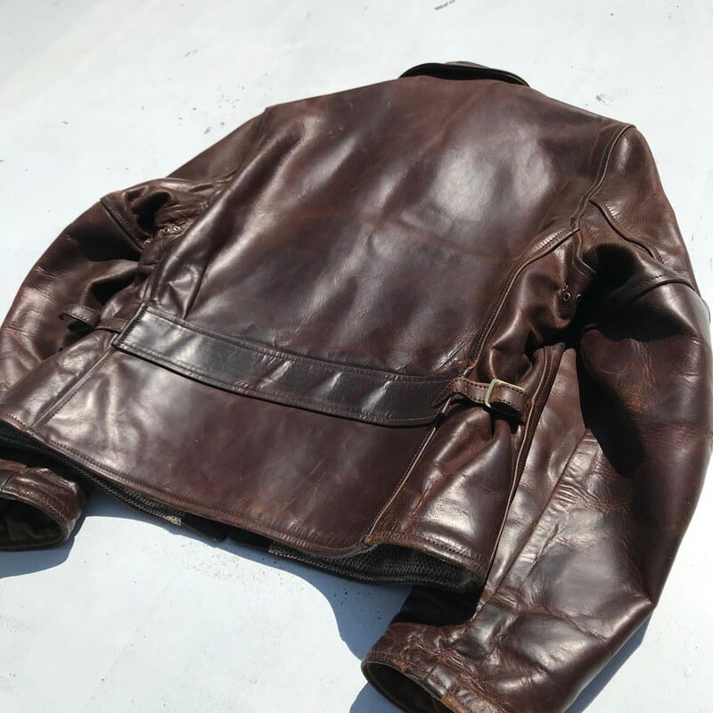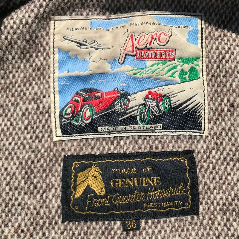 AERO LEATHERのHALF BELTレザージャケットです。1975年にロンドンで創業したブランドです。85年にスコットランドへ拠点を移しました。こちらはスコットランド製ですので、85年以降に作られたモデルです。新品当初は支え無しで自立するほど硬く(通称エアロ立ち)、着込む程に体に馴染み柔らかくなっていきます。こちらのアイテムはハーフベルトと呼ばれるモデルでサイドにアジャストベルトが付いております。丁寧にメンテナンスされていたのかレザーはとてもしなやかです。使用感があり肘や袖口に擦れ等見られます。これからも十分に経年変化を楽しめる1着です。サイズは36で、170cm70kgでジャストサイズです。