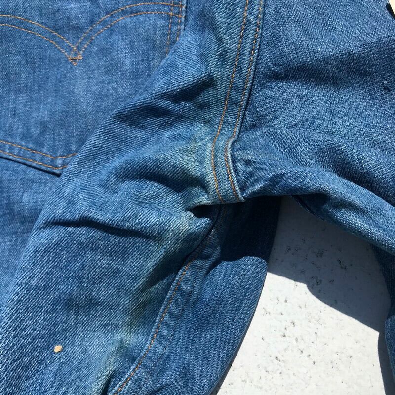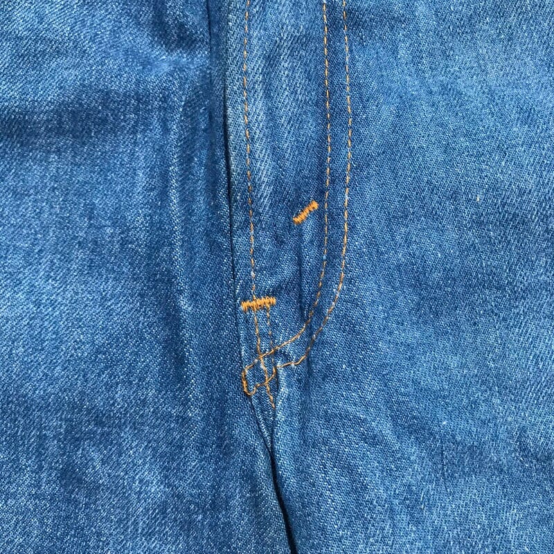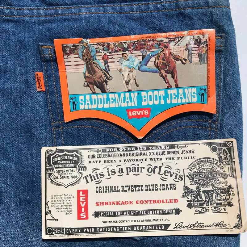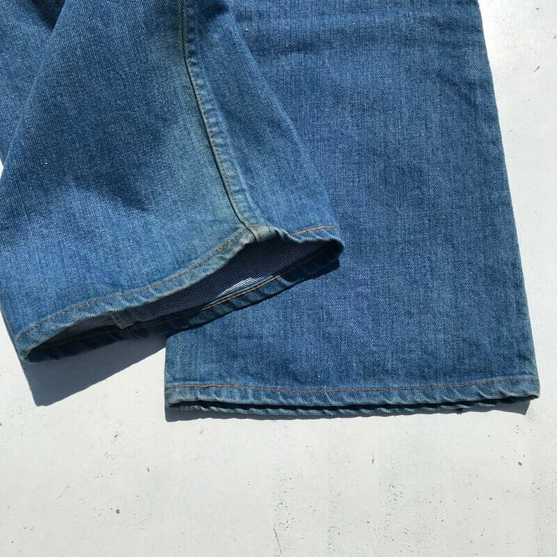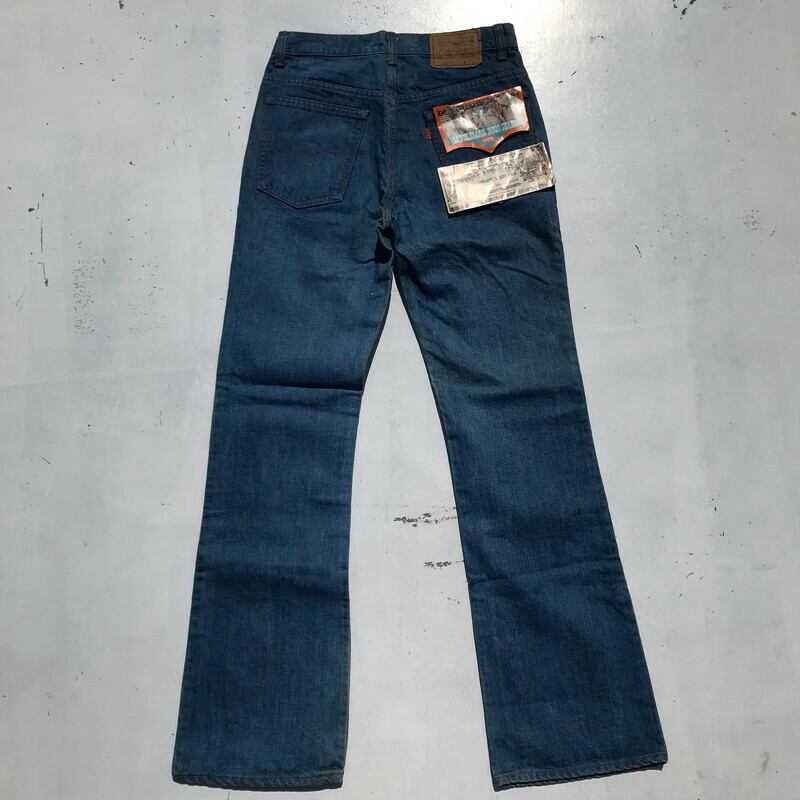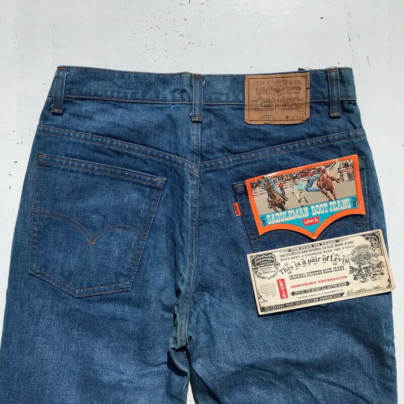 70年代の20517-0217ブーツカットデニムです。サドルマンの名称で有名なこちらは未使用ではございませんが希少なフラッシャー付きとなります。ボタン裏刻印8、42TALON。恐らく大事に保管されていた後にホッチキスで留めたと思われます。全体にフェードしています。内ももと裾にヤケが見られますが、これからの季節に合わせやすいカラーとなっております。レングスもオリジナルですので長身の方でもご着用して頂けます。