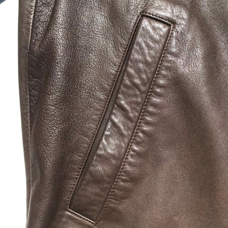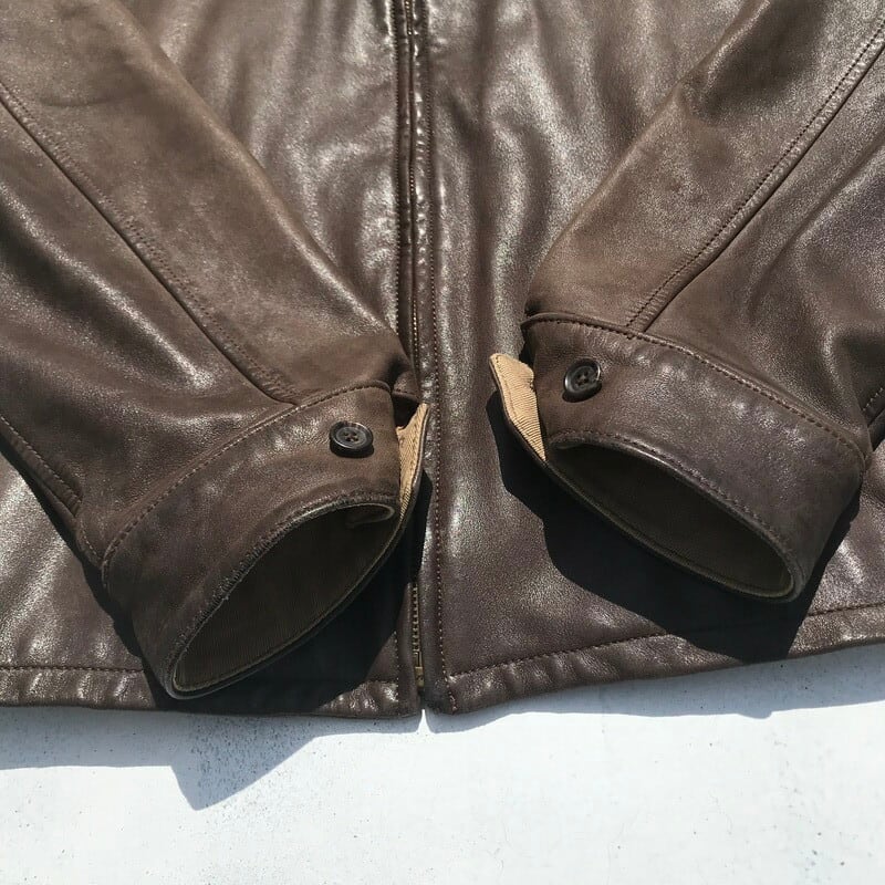 ポロラルフローレンラムレザージャケットです。しなやかなラムレザーを使用しており落ち着いたダークブラウンカラーが大人な1着です。全体に擦れ等の使用感がございます。右腕にシミ、全体にも小さなシミ等ございます。オイルメンテナンス等でなじみやすくなると思われます。サイズはXLですが170cm70kgで程よいサイズ感です。ラムレザーのエイジングも存分に楽しめます。定価は10万円近くしますので大変お買得です。
