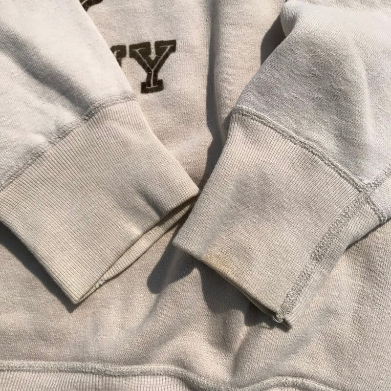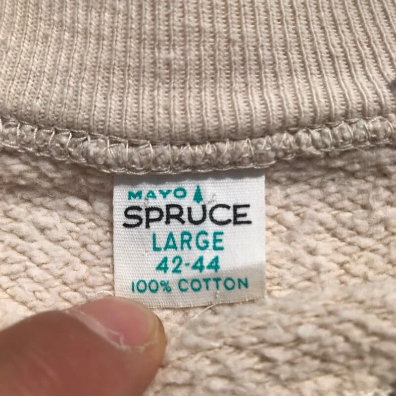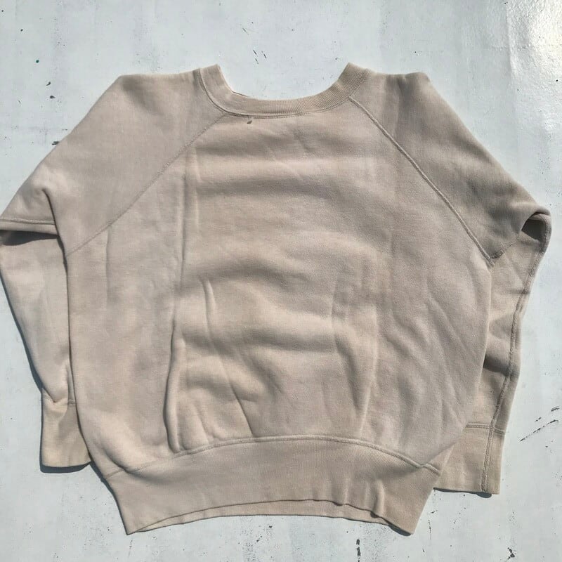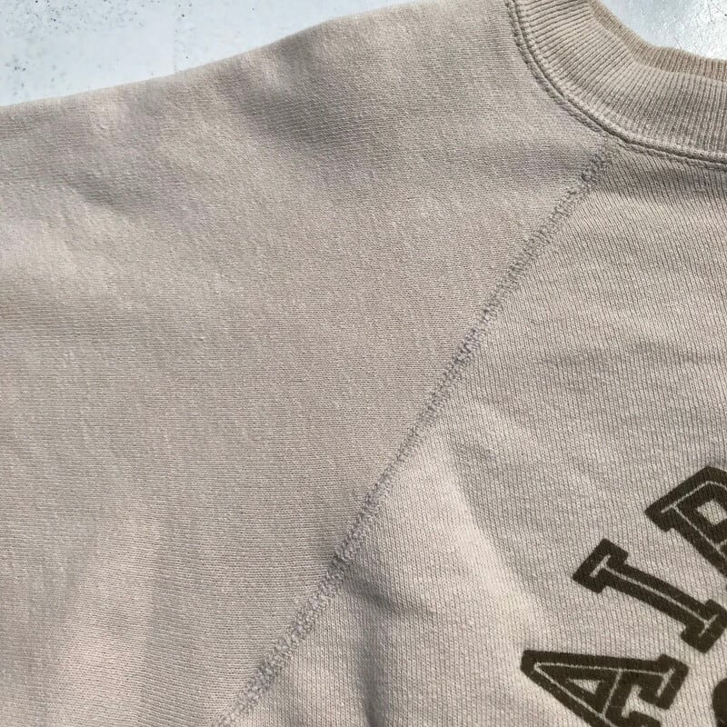 60年代頃のU.S.AIRFORCE ACADEMYのラグランスウェットです。フロッキープリントが施されており、通常はエアフォースブルーを連想させるライトブルーボディがメジャーですが、こちらはあまり見かけないベージュのSPRUCE社製ボディが使用されています。SPRUCEのタグはレジスターマークが記載されていませんので、60年代頃に製造された物と思われます。フロッキーもしっかり残っており美品です。左袖にうっすらとインク汚れのようなシミがございますがリブ伸びもほとんど無くサイズもMサイズでゴールデンです。女性にもおススメした1着です。【身幅】57.5cm【着丈】57.5cm【袖丈:ラグランの為脇下から】53cm