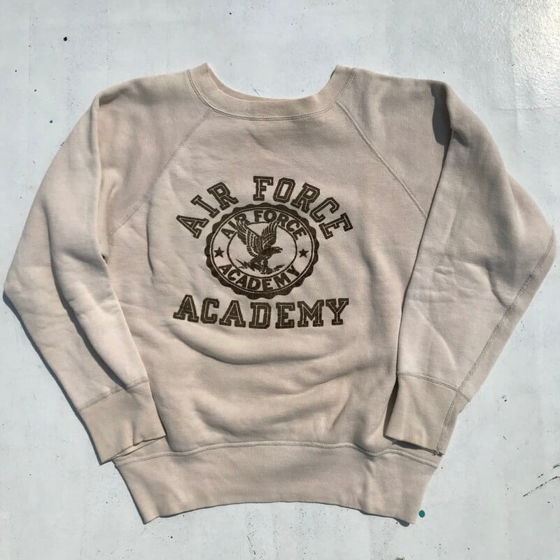 60's U.S.AIR FORCE ACADEMY フロッキープリント スウェット USAFA SPRUCE 空軍士官学校 ベージュ レアカラー LARGE ミリタリー 美品 希少 ヴィンテージ