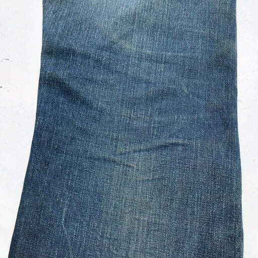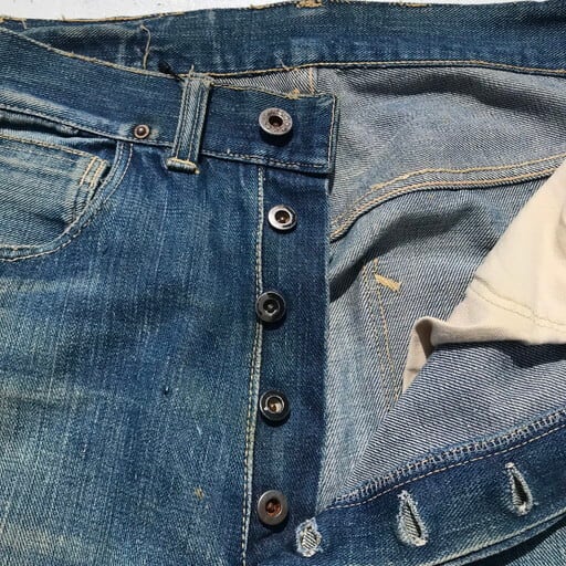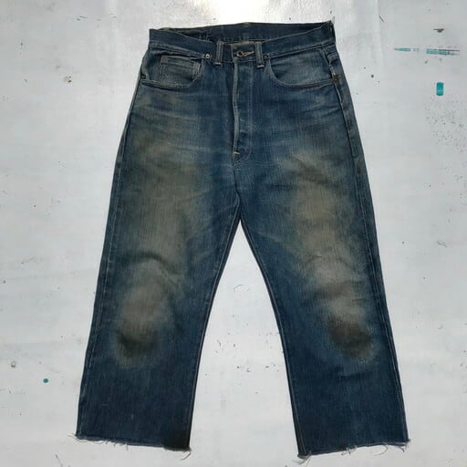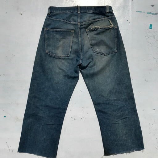 40年代頃のストアブランド5ポケットデニムパンツです。パッチ欠損の為メーカーは不明ですが、月桂樹ボタンにドーナツボタンが使用された俗に言う大戦モデルのディテールを兼ね備えています。UFOリベットや、Leeのようなカンヌキ留めが特徴的で、レプリカントブランドでもサンプリングされています。股にダメージ、腿に補強のリペア有り、バックポケットにダメージがございます。裾はカットされクロップド丈になっています。加工では出せない年代を感じる色落ちはまさにヴィンテージラバーには堪らない至極な一本です。希少なアイテムですので、是非コレクションにいかがでしょうか。