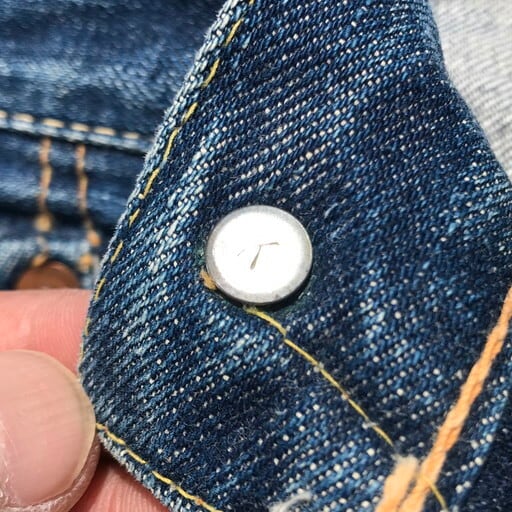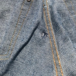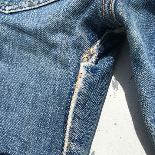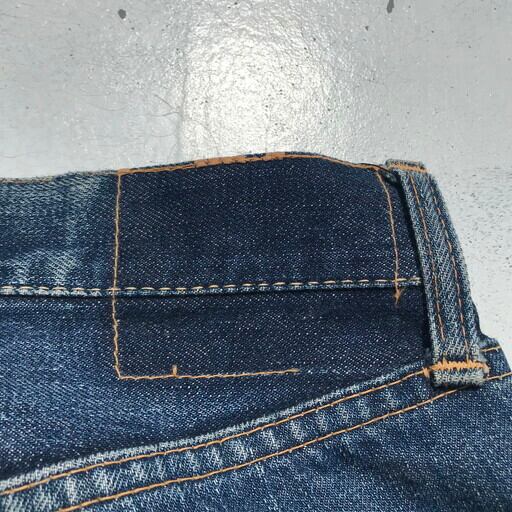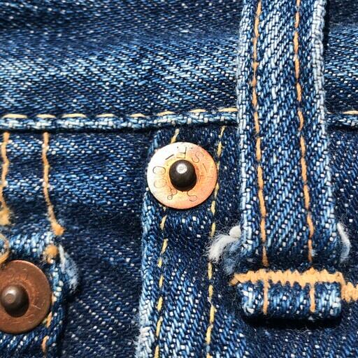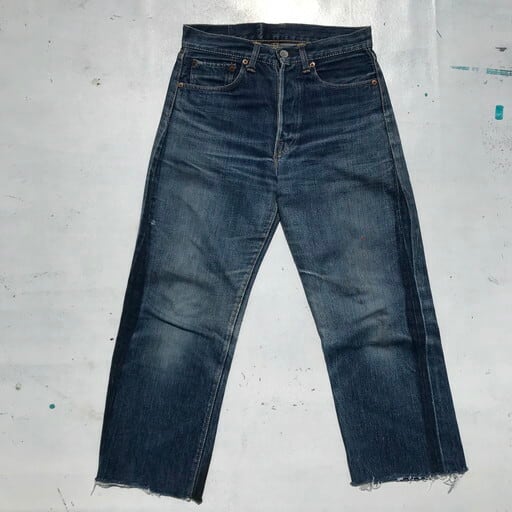 50年代から60年代初頭頃のリーバイス501XXです。Vステッチ(ウエストシングル)、刻印K、フライボタン足長R、銅製リベット、隠しリベット、赤タブ欠損。サイズが小さく503BXXのようにも見えますがフライボタンは3つですので、元のサイズもW28~29程の501XXで間違いないかと思われます。サイドのアウトシームが縫い直しで拡張されており、裾はカットオフとなります。背面センターステッチ脇に小さなリペアが有り、股に擦れたダメージがございます。かなりサイズが小さめです。クロップドパンツのようにくるぶしを出して合わせたり、小柄な女性でも合わせやすいかと思いますので、サイズが合う方は大変お買い得ですので是非。
