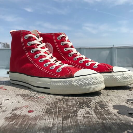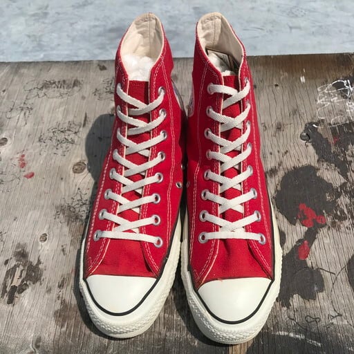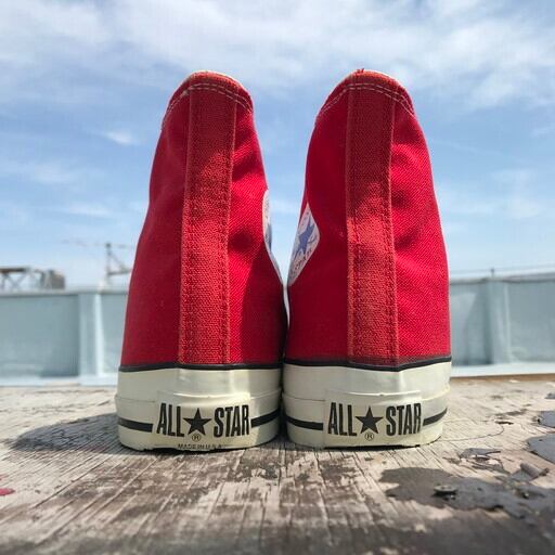 90年代初期頃のコンバースオールスターハイです。今では希少なUSA製で、オールスターの中でも人気のレッドです。年々良いサイズや状態の良い物が少なくなり、特にカラーコンバースは人気が有るためマイサイズが有れば迷わずに購入という方も多いのではないでしょうか。US9と程よいサイズです。ソール減りも少なく非常に状態は綺麗です。付属品はございません。デニムはもちろん、みりたりパンツとも相性抜群です。
