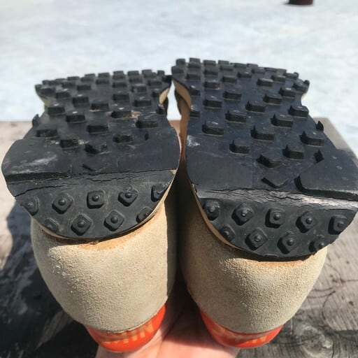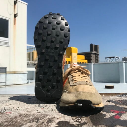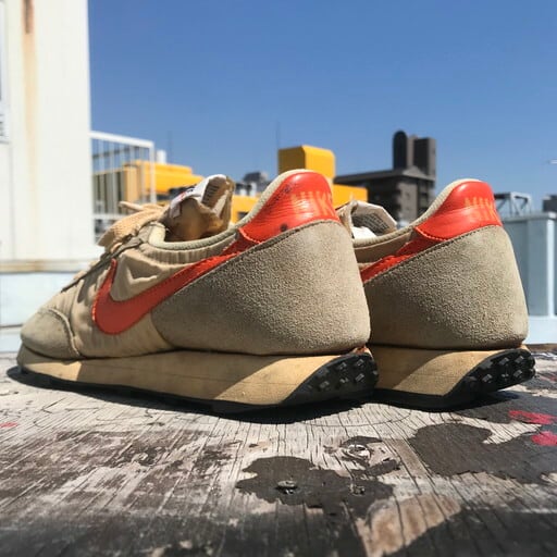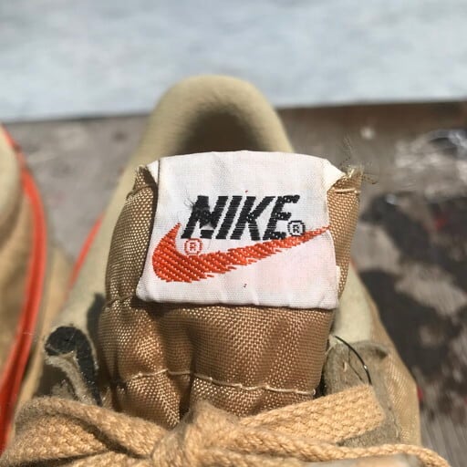 70年代後半のNIKE DAY BREAKです。アリゾナ砂漠の朝日からインスパイアされたこちらのモデルは、ヴェクターラストという左右の見分けが付かないような真っすぐなラストが採用されています。サンドベージュに鮮やかなオレンジが他のモデルでは無いカラーリングで根強い人気があるも捏です。ソールの硬化はございませんが、踵付近に若干割れが見られます。シュータンのスポンジはほどんどございません。サイズはUS9位です。ソールはリペアで張り付けされています。こちらもオリジナルは大変希少ですので、コレクションにいかがでしょうか。