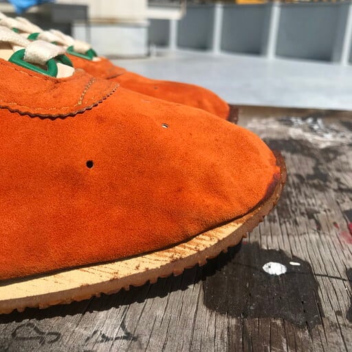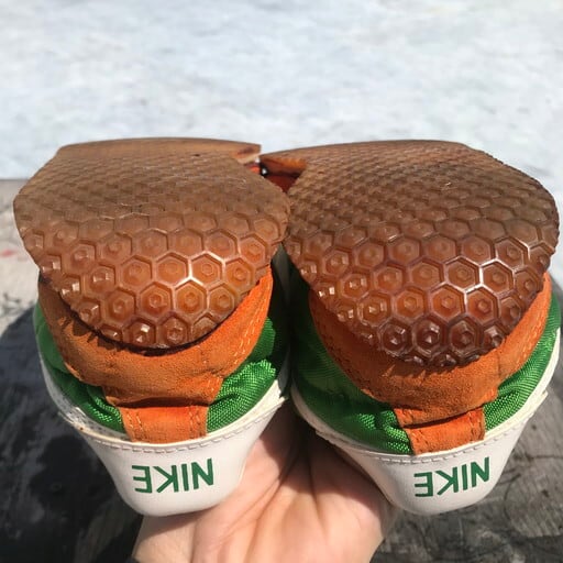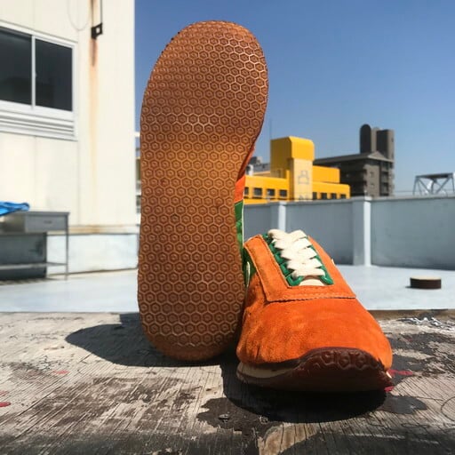1976年から1977年頃のNIKE THE STINGです。ナイキが初めて契約した伝説的アスリート”スティーブ・プリフォンテーン”の為に作られたスパイクのPRE MONTREALをレーシングフラットシューズへとモデルチェンジしたのがこのスティングです。発色の良いスエードとナイロンのコンビは唯一無二のデザインでNIKEフリークのみならずスニーカーマニアも垂涎のアイテムと言えます。ソールの表面は若干硬化していますがスポンジ自体はまだ柔らかい状態です。サイズはUS10とまさにゴールデン!アッパーの状態も非常に良いスペシャルですので、