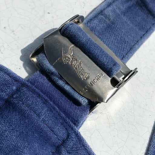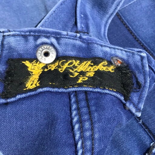 50年代頃のフレンチモールスキンワークオーバーオールです。A ST MICHELというメーカーの物で、ウエスト部分に刺繍タグが付きます。ショルダーの金具に大天使ミカエル像が描かれており、凝った作りが特徴です。ウエストサイドは2段階で調整可能でボタンは黒ラッカーで塗膜されたドーナツボタンです。背面はローバックスタイルというのも◎。全体のフェードに加え左フロントポケットのリペアが絶妙な雰囲気でかっこよい1着です。170cm70kgのスタッフで程よいサイズ感です。USAメイドのワークオーバーオールに比べシルエットはすっきりしております。ウエストはゆったりとしていますが、女性でも合わせやすいと思います。