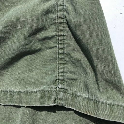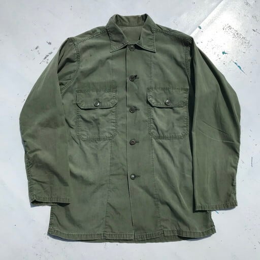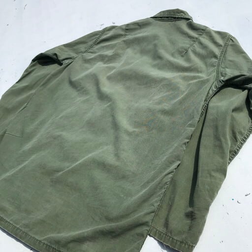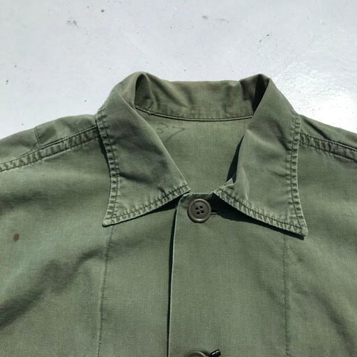 60年代頃のユーティリティーシャツです。一見ただのコットンサテンシャツに見えますが生地にコットンポプリンを採用しており、ユーティリティーシャツ100着に1枚見つかるかという少し珍しいアイテムです。ショルダーにタックが入りウエストには若干の絞りがございます。OG107でいう筒袖の2ndモデルに相当しますが袖のストラップは省略されております。薄手でこれからの季節でも使いやすい生地感です。サイズはS~Mですので男女共に合わせやすいかと思います。全体に色褪せや袖にピンホール等あり使用感はございます。フロントボタンの下段2つは付け替えられています。他のユーティリティーシャツをお持ちの方は是非生地感の違いを楽しまれれてはいかがでしょうか。