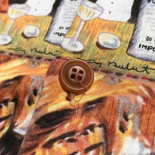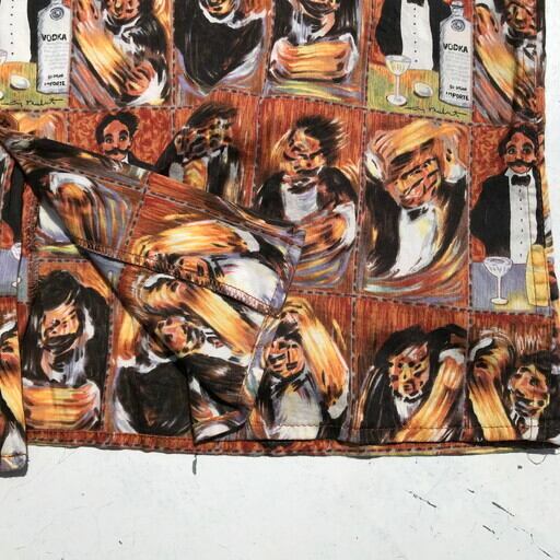 reyn spoonerの珍しいバーテンダー柄シャツです。フランス人画家のGuy Buffetの味のあるデザインが人気のシリーズです。中でもバーテンダー柄は非常に人気もあり描かれた人物の独特な表情がほっこりするデザインです。エジプトコットンを使用しており滑らかな肌触りです。タグに糸の解れが見られますがその他はダメージ等も無く綺麗です。Barで働いている方やお酒が好きな方におすすめしたい1着です。
