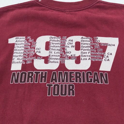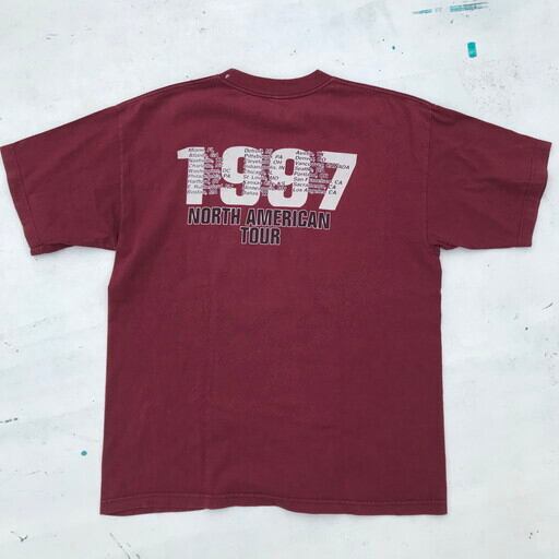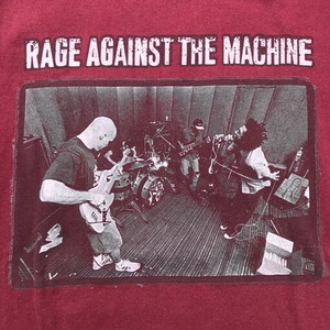 90年代のRAGE AGAINST THE MACHINEツアーTシャツです。1996年に発売された2ndアルバム「Evil Empire」のNORTH AMERICAN TOURのTシャツとなります。エンジのボディにレコーディング風景がプリントされており非常にかっこよい1枚です。コピーライトはございますが、薄れていて読みづらくなっています。使用感はございますがダメージ等無く良好です。サイズはXLですので、フェス等で着用するには最適かと思います。