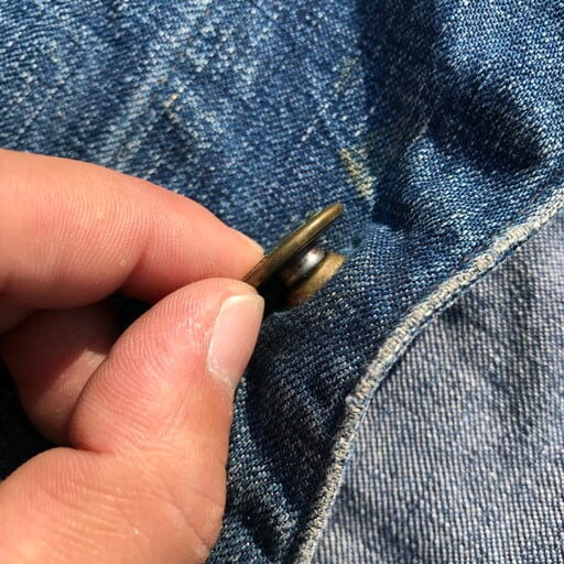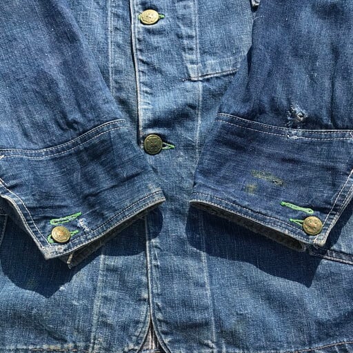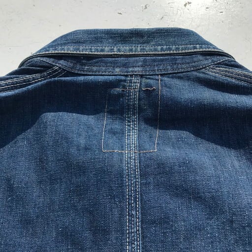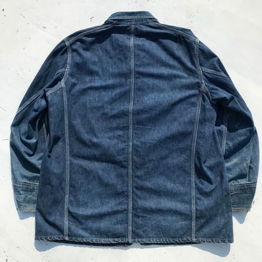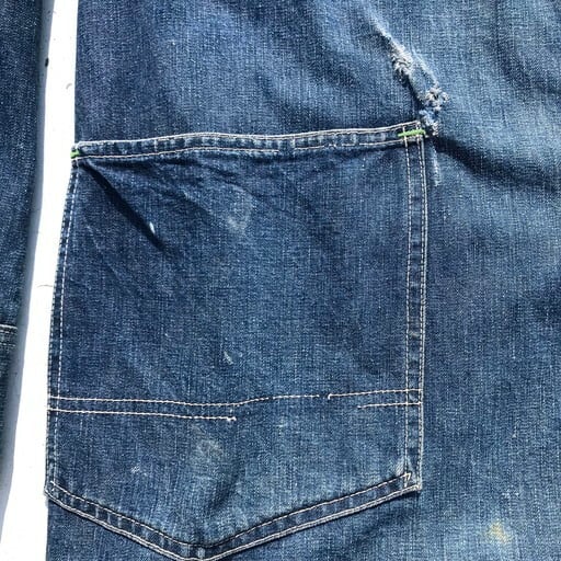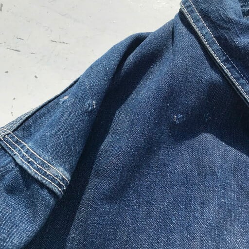 50年代頃のOSHKOSHデニムカバーオールです。サイドトリプルステッチ、首振りボタン、角ばったポケットデザイン等からこの年代と推測されます。色味は比較的まだ濃いめでこれからのエイジングも楽しめるのではないでしょうか。所々に擦れや穴、ダメージがございますが致命的な物は無いので簡単なリペアで大丈夫と思われます。フロント左ハンドポケットにユニオンチケットがございます。タグは欠損していますが、サイズは大きく、44~46程はあると考えられます。程よいダメージがヴィンテージらしさを際立たせたバランスの良い1着です。