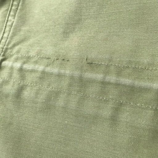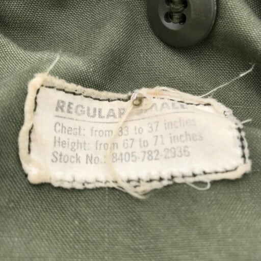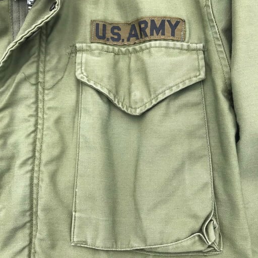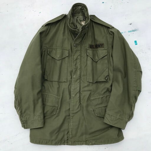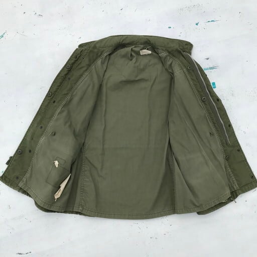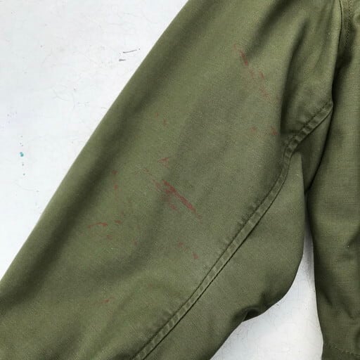60年代頃のU.S.ARMYフィールドジャケットです。アルミジッパーが採用されたセカンドモデルとなります。首元とフロントはCONMAR社のアルミジッパーを採用、袖口にはマチのあるモデルです。右袖とフロント一部に赤茶のペンキのような汚れがございます。ジッパーの差し込み部に生地の劣化が少し見られますが、今のところ開閉に問題は御座いません。サイズはREGULAR SMALLですので、日本人向けのゴールデンサイズです。3rd、4thに比べ希少な2ndタイプです。M-65フィールドジャケットは流行に囚われないミリタリーの定番アイテムですので、この機会に是非手にして下さい。