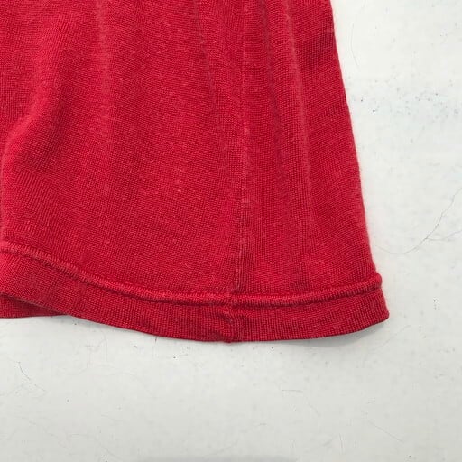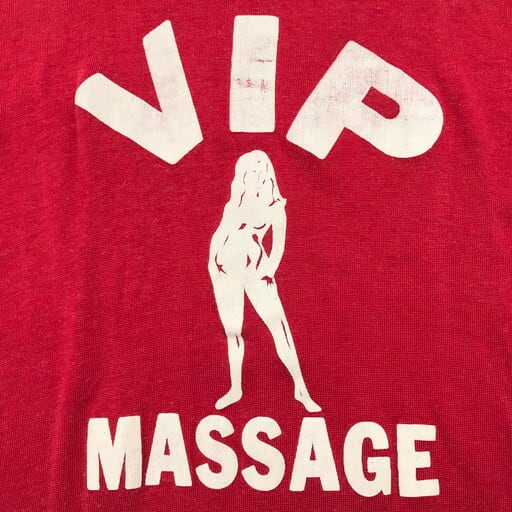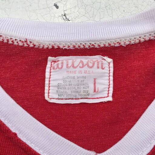 60年代頃のWilsonレーヨンゲームTシャツです。発色の良い赤白ボディにラバープリントでVIP MASSAGEとプリントされています。裸体の女性にマッサージとあると如何わしく感じますがスポーツ選手用のジョークデザインと思われ、とても珍しい1着です。レーヨン特有の生地の毛羽立ち等見らえますが目立つダメージ等無く比較的良好です。エロデザイン物はコレクターもいらっしゃいますので、お好きな方は是非。