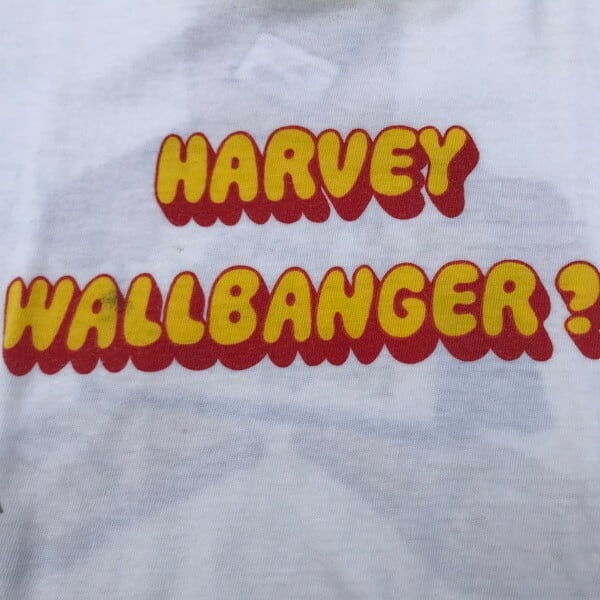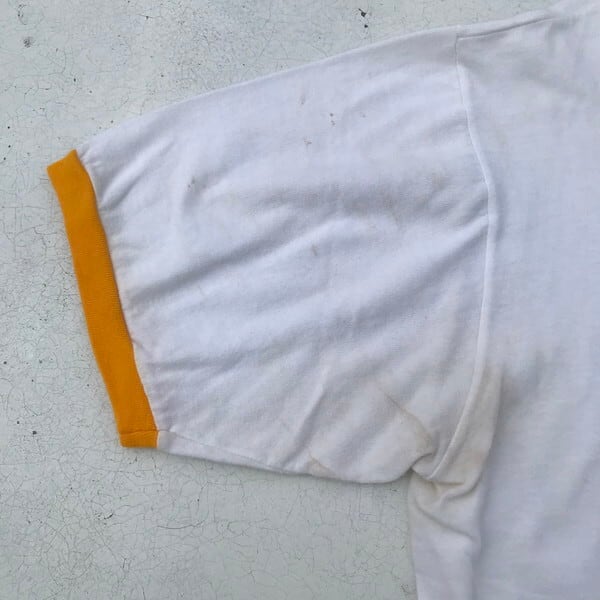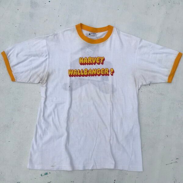 70年代のチャンピオンリンガーTシャツです。71~73年頃のバータグが付きます。イエローのリンガーで、HERVEY WALLBANGER?の染み込みプリントはチャンピオン好きなら1度は目にした事もあるのではないでしょうか?HERVEY WALLBANGERとはカクテルの名称で、背面にはそのカクテルのレシピを持ったキャラクターがプリントされています。所々にシミや汚れが有り、脇アタリも汚れています。。リンガーの付け根も少し色移りしております。使用感こそございますが、ダメージは特にございません。Bar等に飾ってあっても良い1枚ですね。