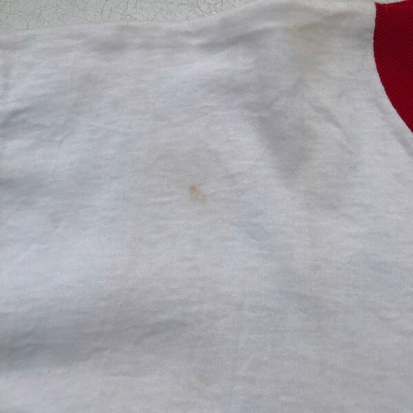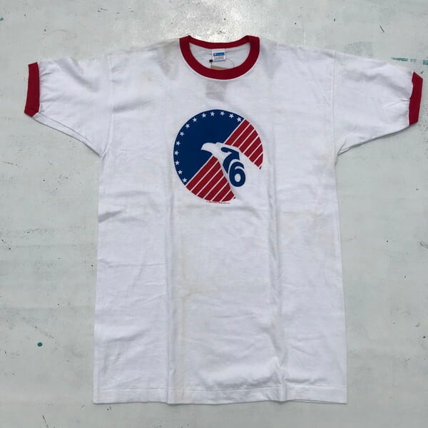 70年代のチャンピオンリンガーTシャツです。後期のバータグが付きます。76と13個の星の染み込みプリントで、1976年に建国200周年を記念して作られたアニバーサリーTシャツです。1776年アメリカ建国当時の13州を意味するデザインとなっております。ダメージや撚れもほとんど無いですが、保管時についたと思われるシミが右肩とお腹付近、背面腰付近にございます。