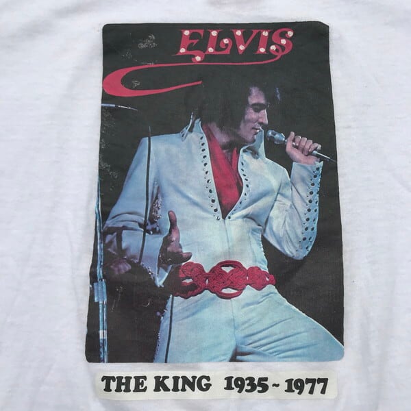 70年代頃のエルビスプレスリー追悼プリントTシャツです。オフィシャル物ではございませんが、エルビス愛の溢れる1着です。ボディはHanes社製。両サイドにシミ汚れがございます。1970年代初頭にラスベガスで行われたサマーフェスティバルコンサートでの一コマを映した写真と思われます。プリントが一部擦れて薄くなっている箇所が見られます。今日のロックミュージックの礎を築いたといっても過言では無いほど、彼の残した功績は偉大です。