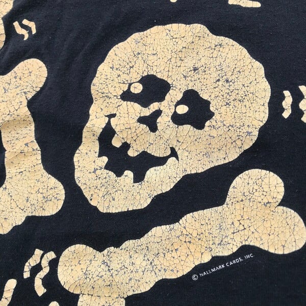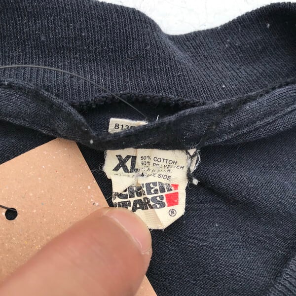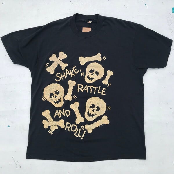 70年代から80年代頃のスカルプリントTシャツです。SHAKE RATTLE AND ROLLの文字とPOPなスカルが蓄光塗料でプリントされていますので、暗闇でうっすらと光ます。ボディはSCREEN STARS。アメカジレプリカントブランドのWAREHOUSEでもサンプリングされていたデザインです。プリントのヤケ、ひび割れ、首元内側に解れが有り、首リブに小さなピンホールが2箇所ございます。XLとゆったりしていますので、緩めのペインターパンツなど」と合わせてみてはいかがでしょうか。