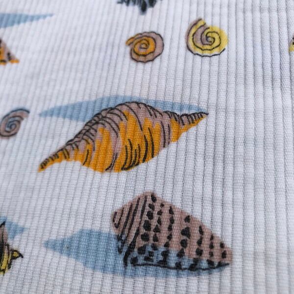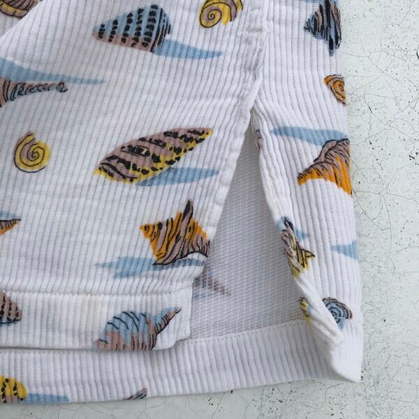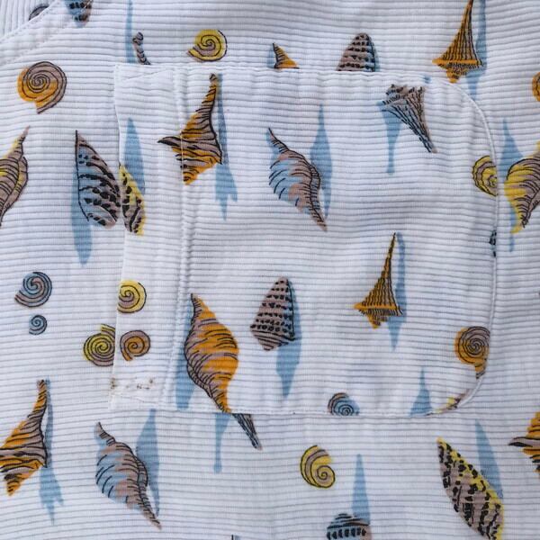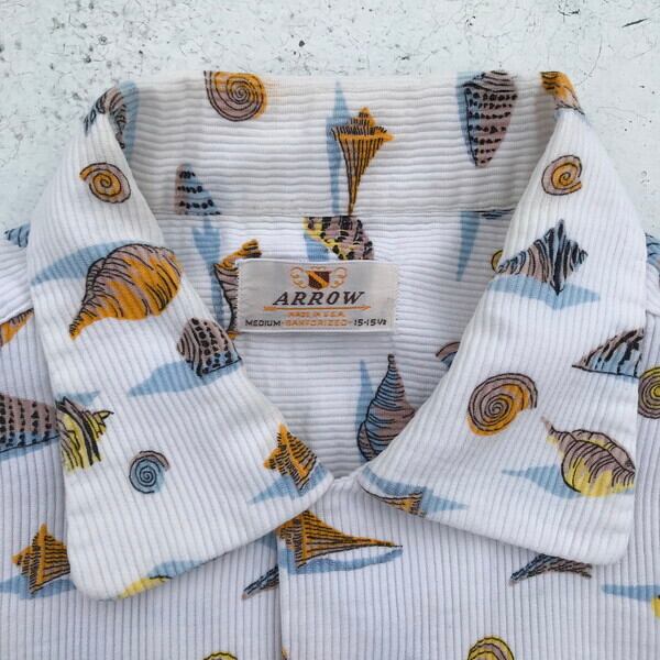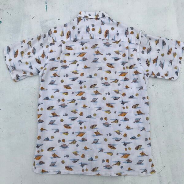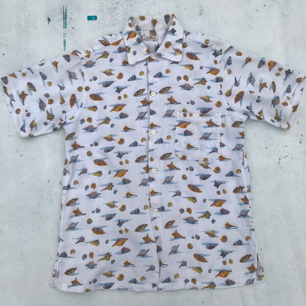 こちらのシャツはあまり見かけないピケタイプの生地が使われており、コーデュロイとは違う立体感がおもしろい1着です。襟は丁寧に袋縫いされており、先端は丸みを帯びております。ボタンは全てオリジナルです。全体に巻貝がプリントされており、非常に涼しげで、これからの季節にお勧めです。胸ポケットと、左袖に若干の汚れがございます。ダメージは特にございません。アロハシャツとは少し違う雰囲気をお楽しみいただけます。