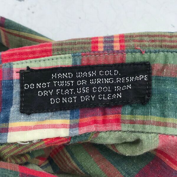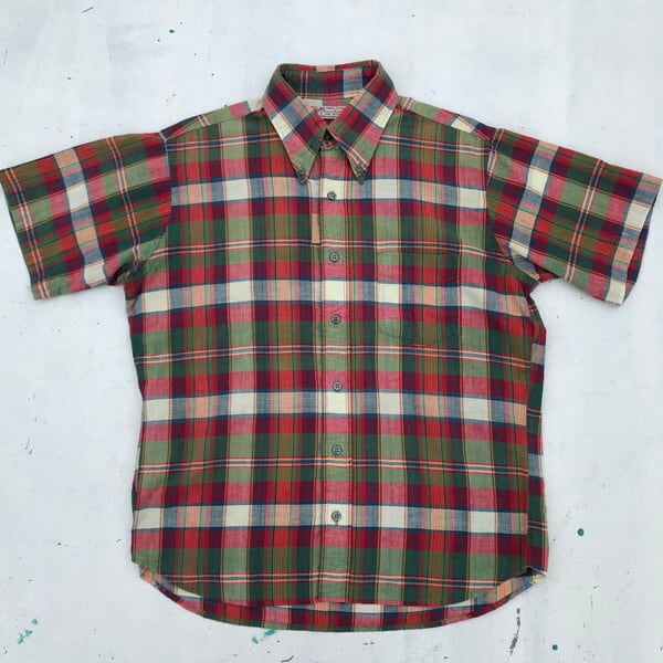 50年代から60年代頃のSun-n-SandマドラスチェックBDシャツです。RN34216、INDIA GARMENTS INCというメーカーのブランドです。赤と緑の爽やかなマドラスチェックがとても綺麗な配色で蒸し暑い季節にはピッタリなデザインです。インド製の上質なコットンを使用しており、さらっとした肌触りです。少し長めの襟先が特徴的で、ポケットはしっかり柄合わせされています。使用感はございますが、汚れやダメージは殆ど無く大変綺麗です。