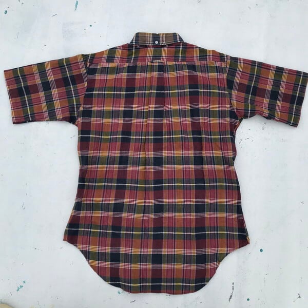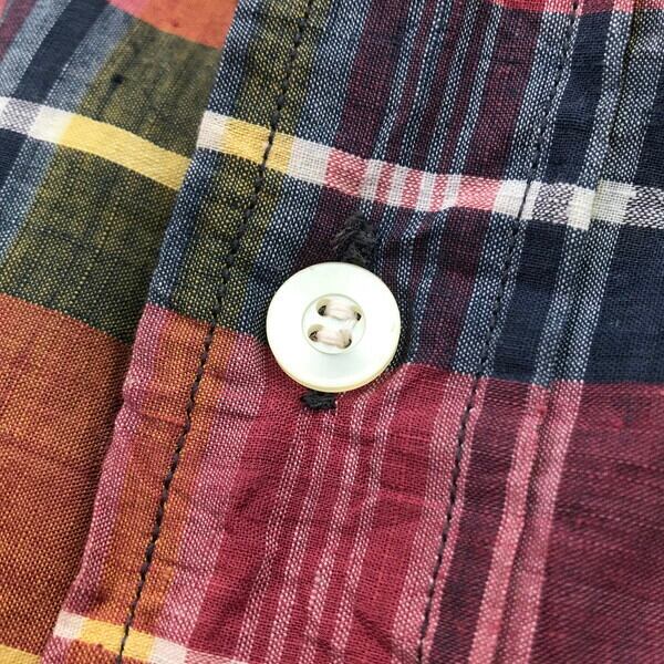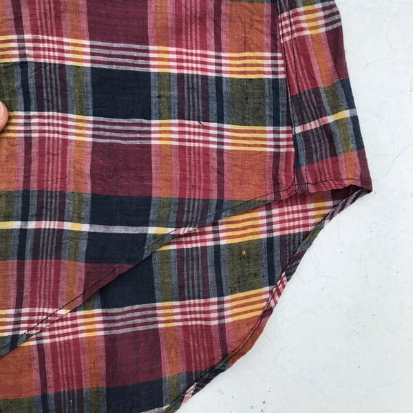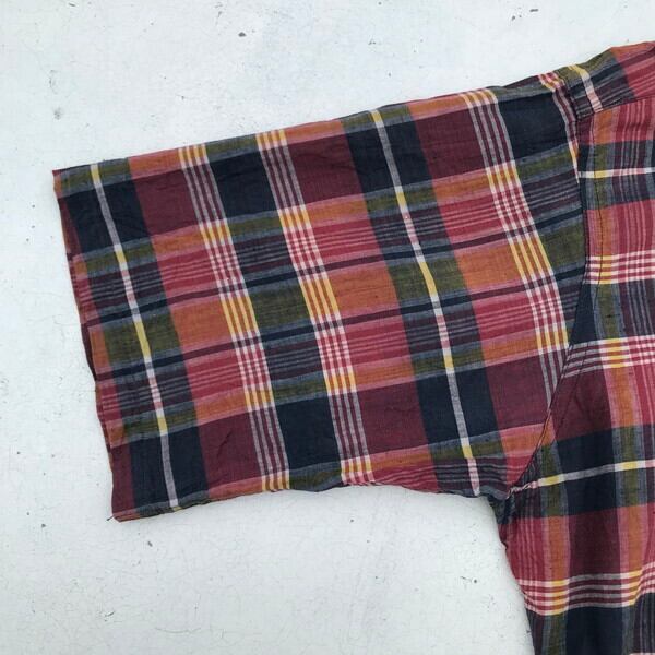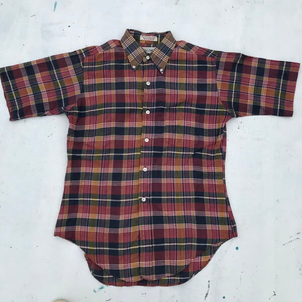 60年代頃のRoos Atkins マドラスチェックBDシャツです。Roos Atkinsはサンフランシスコに1957年に2社が合併して出来た高級紳士服チェーンです。質の良いインド綿を使用しており、リネンのようにさらっとしています。通常の半袖シャツに比べ袖丈が少し長めの作りとなっております。ポケットは柄合わせされています。汚れ等特にございませんがフロントの第2、第3ボタン付近に1mm程のピンホールがございます。色味は落ち着いていますので、シックなコーディネートに合わせてみてはいかがでしょうか。