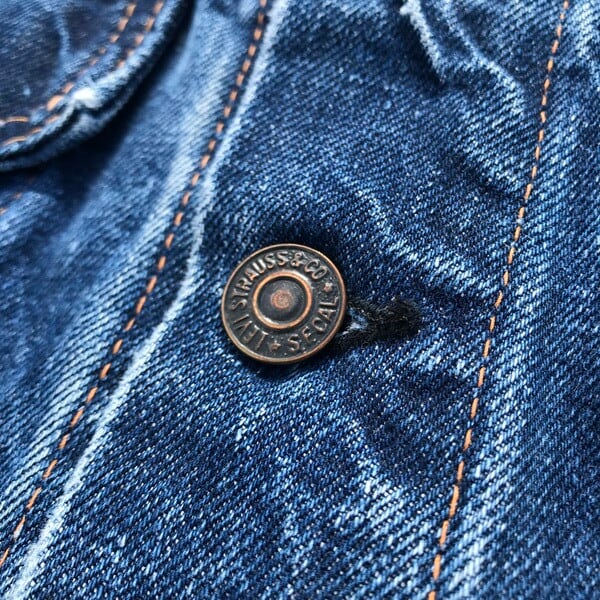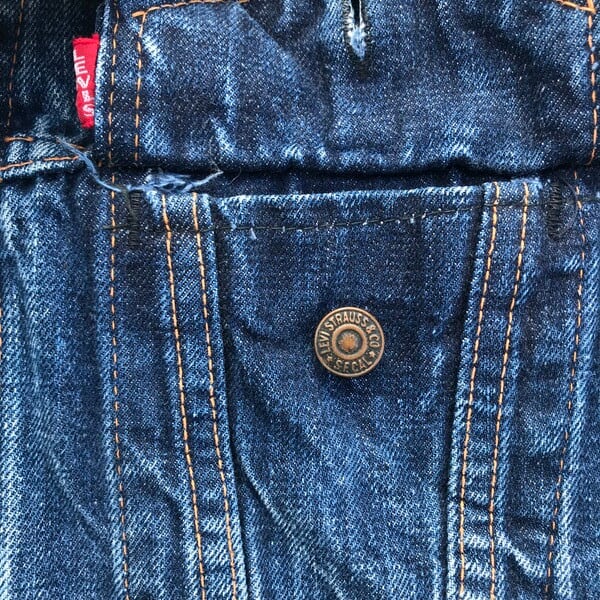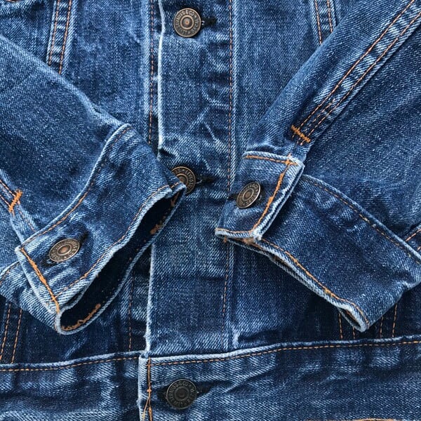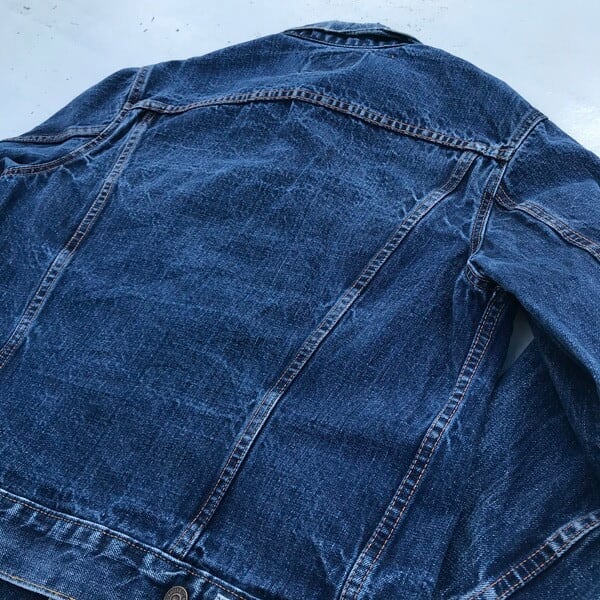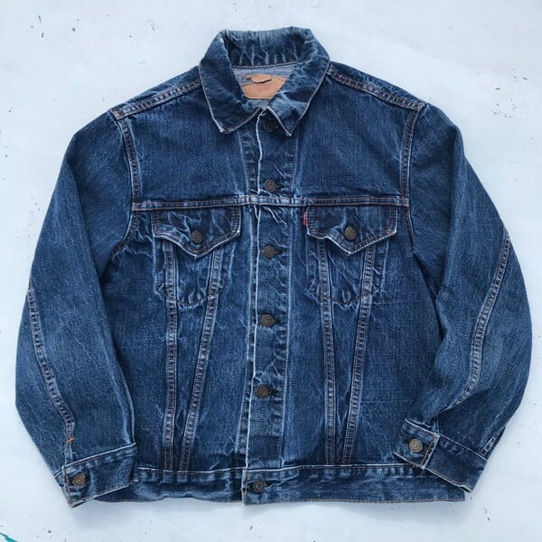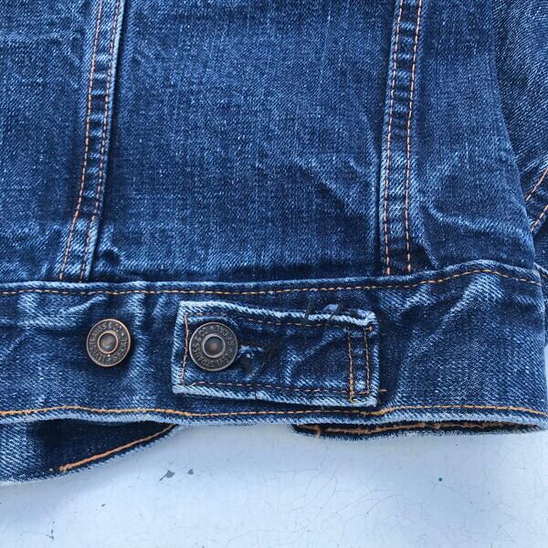 60年代のLEVI'S70505デニムジャケットです。60年代後半から70年代頭頃の紙パッチ下に白いケアタグが付く最終のBig Eモデルの一つ前のモデルと思われます。色残りは4~5割です。ボタン裏刻印526、赤タブBig E、ポケット裏シングルステッチ。紙パッチは割れてますがかろうじて残っています。印字は消えており正確にはわかりませんが恐らくサイズは40程と思われます。これから育てていくにはアタリや色落ちも申し分ないので、経年変化を楽しめる1着です。